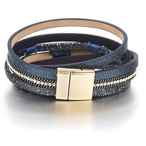 Boho Leather Bracelets Double Wrap Cuff Bracelets Crystal Bead Navy Blue