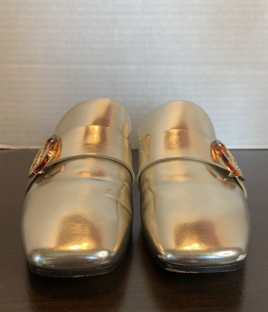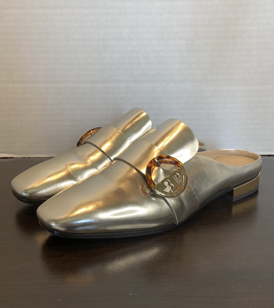 Tory Burch Sidney Silver Metallic Leather Slides Loafers Size 8