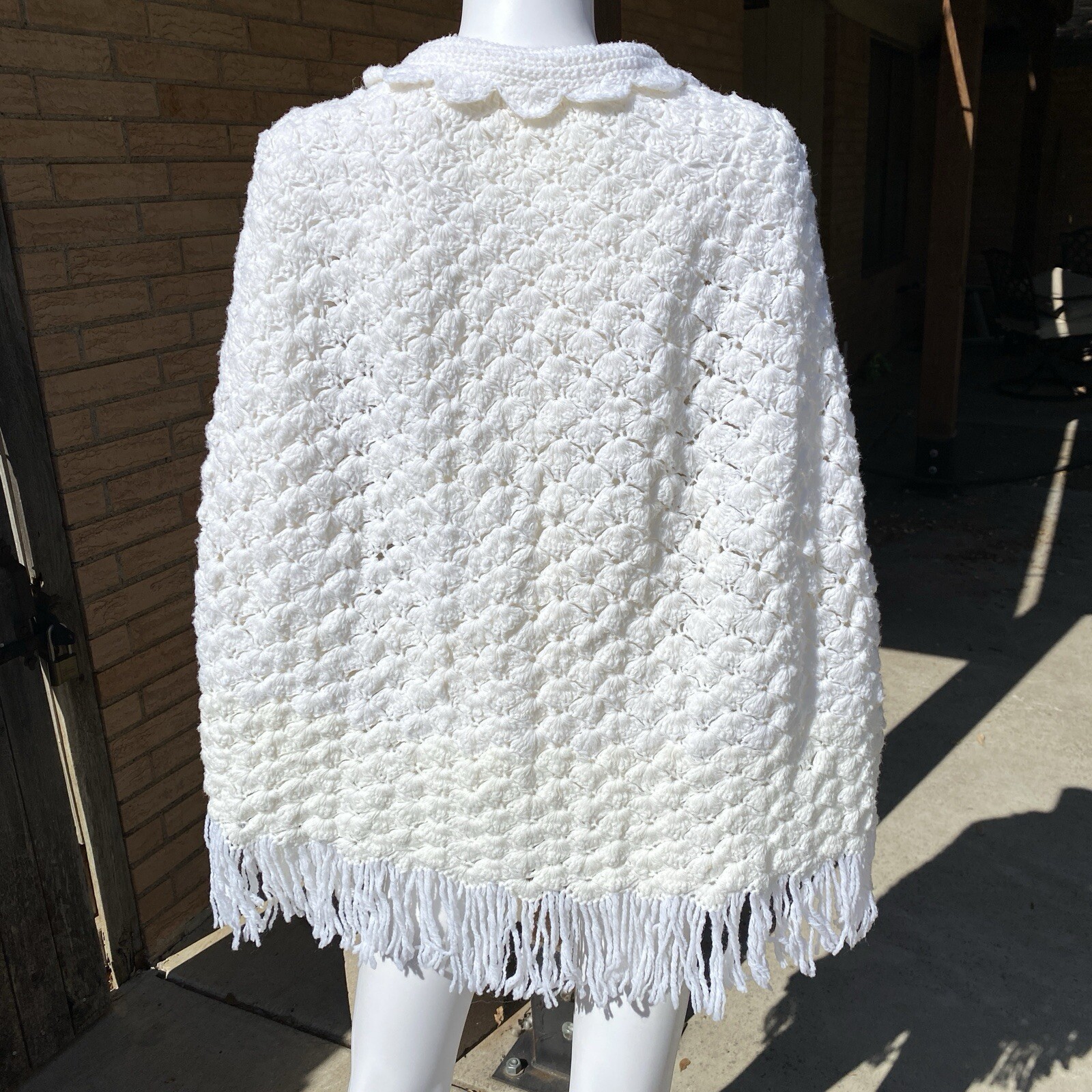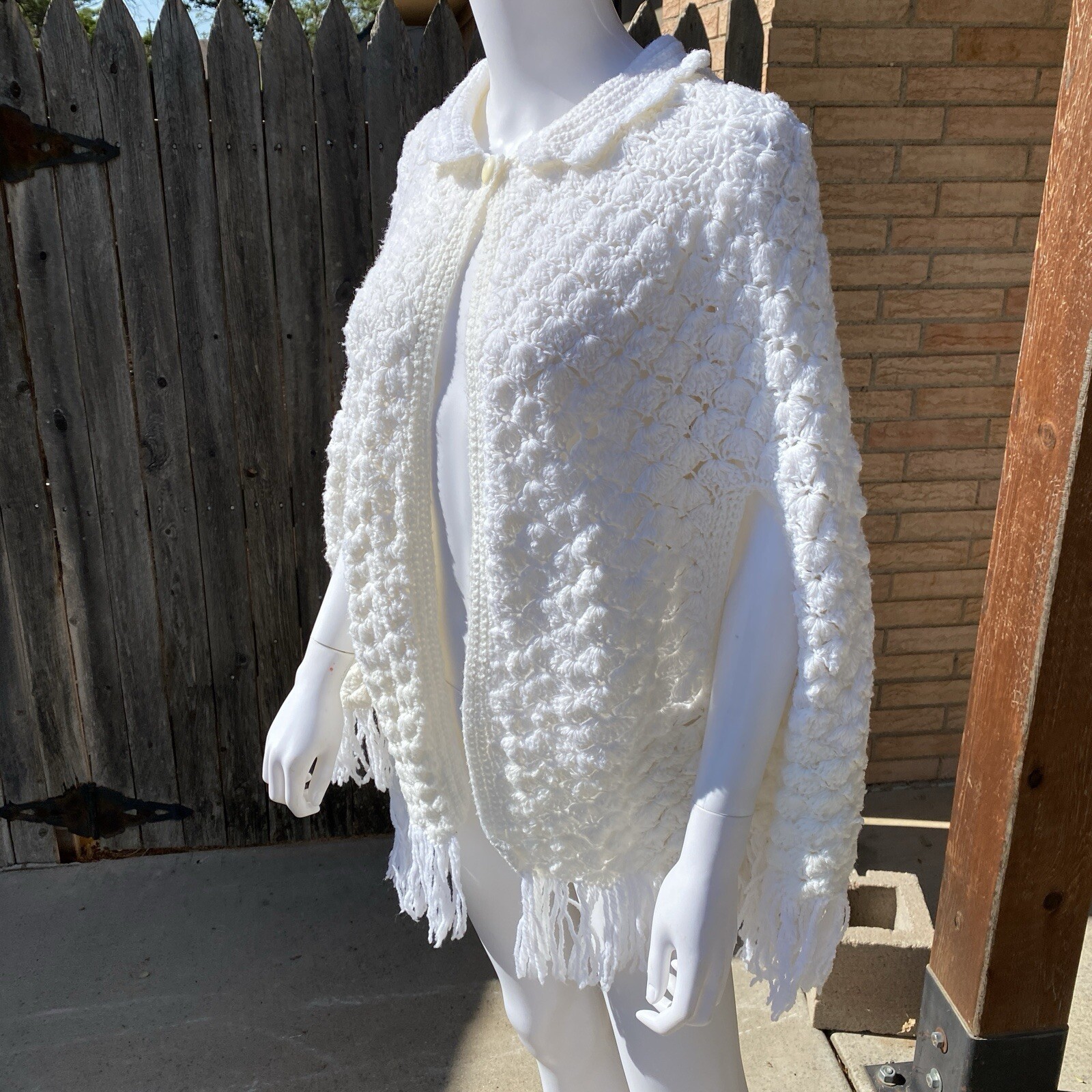 60s 70s Womens Hand Knit Crochet Afghan Cape Shawl Poncho Sweater White Handmade