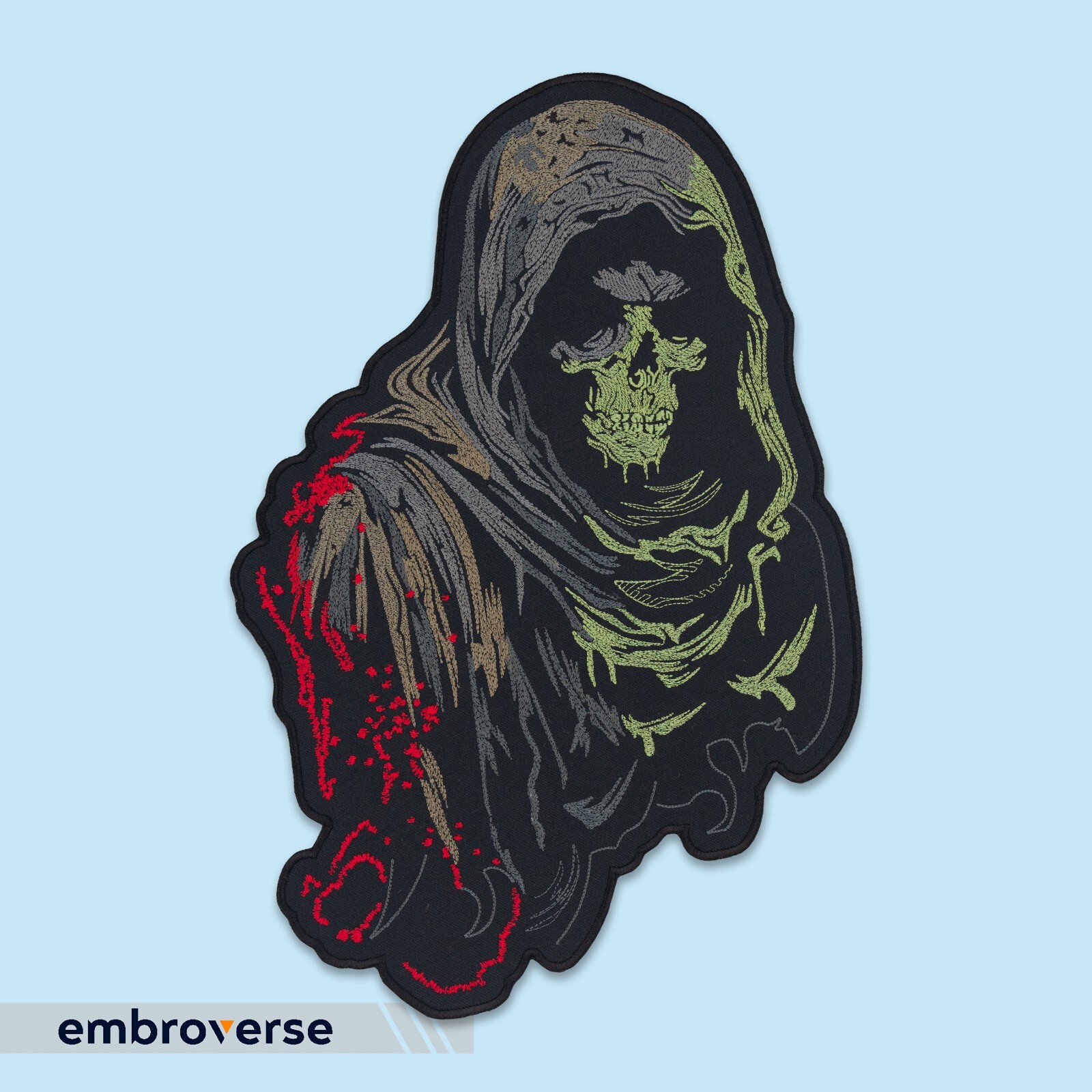 Death Skull Embroidered Back Patch - Large Gothic Grim Reaper, Iron-On