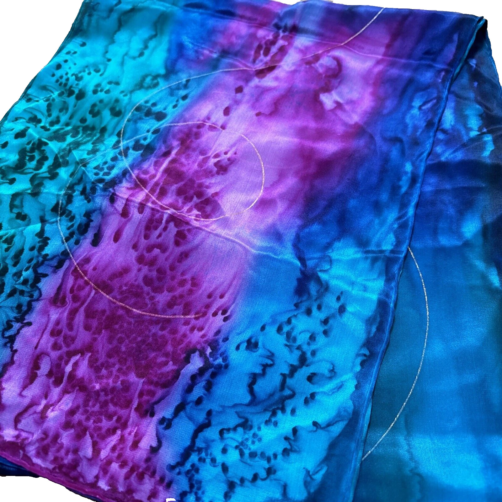 Artisan Hand Painted Pure Silk Scarf Gem Tone Colors Gold Swirls Long Rectangle