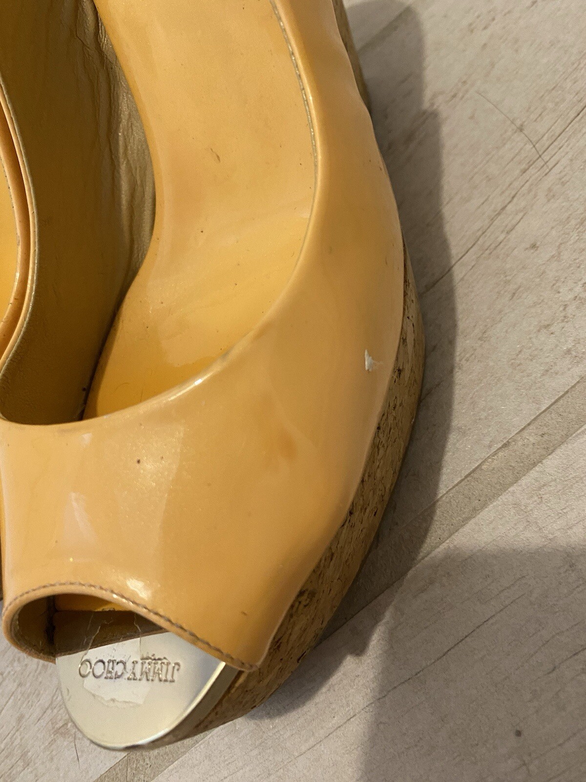как выглядит Jimmy Choo Peach Patent Leather Slingback PeepToe Platform Cork Wedge 39.5 Stain фото