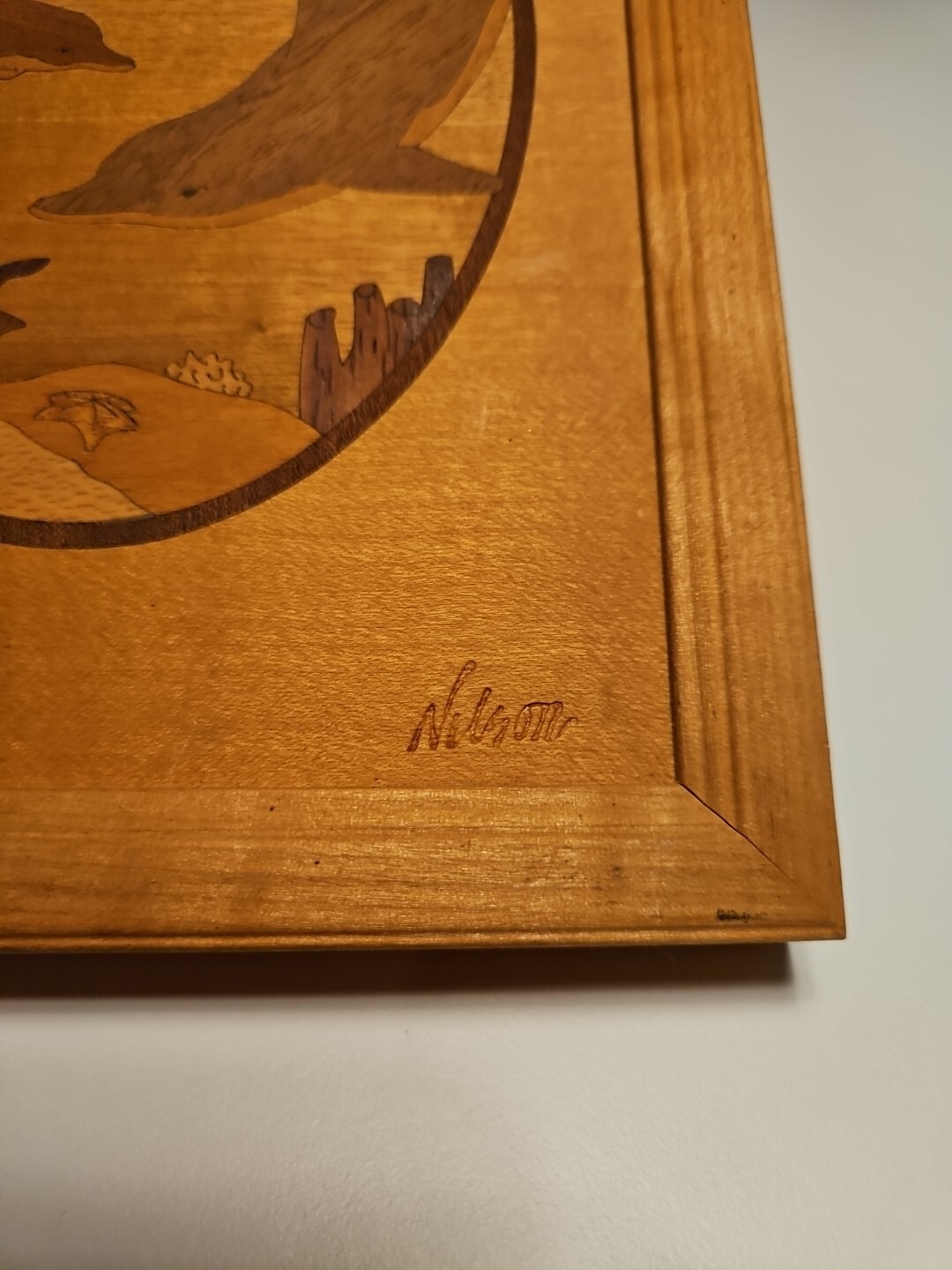 как выглядит Vintage Hudson River Wood Inlay Wall Art "Dolphins Playground" Signed фото