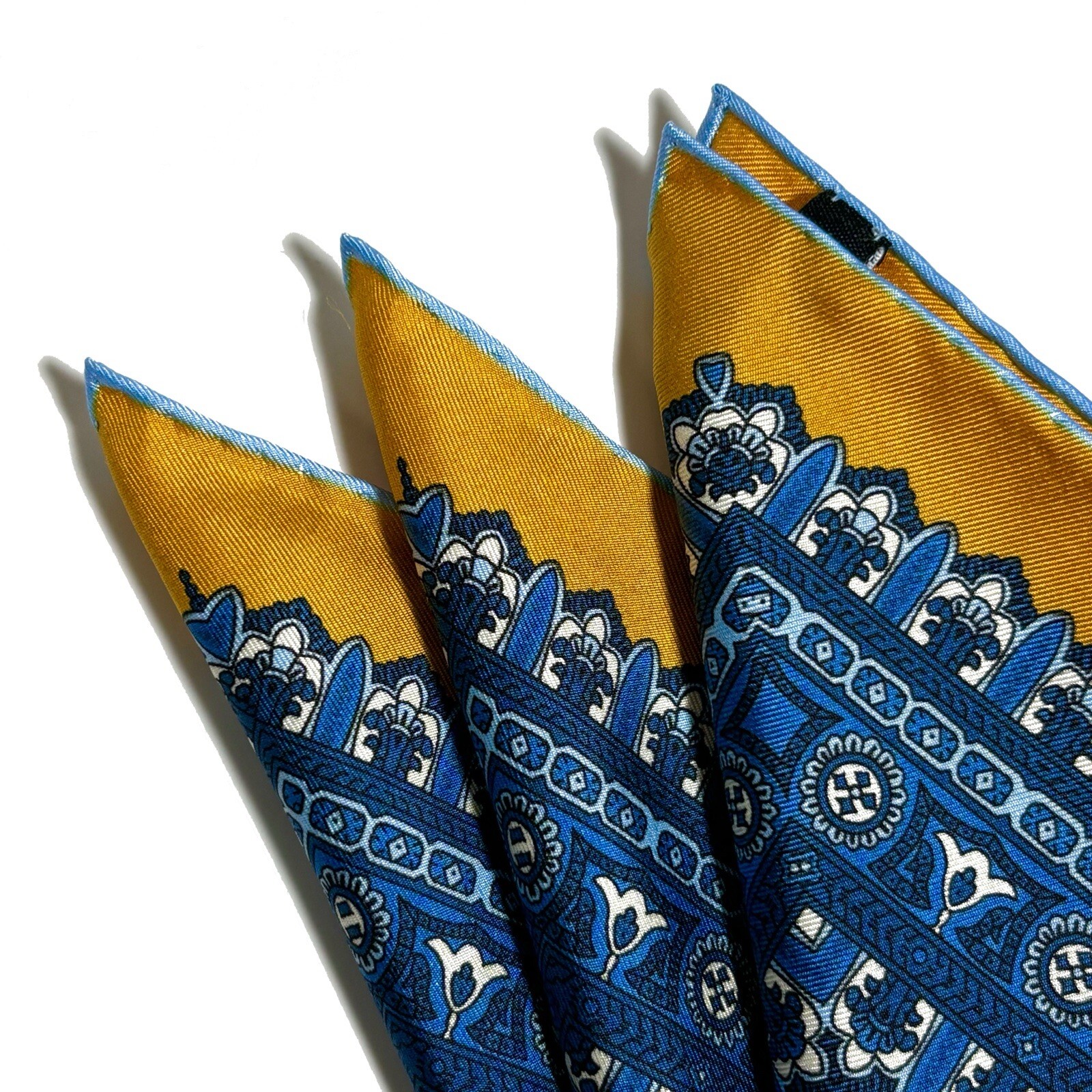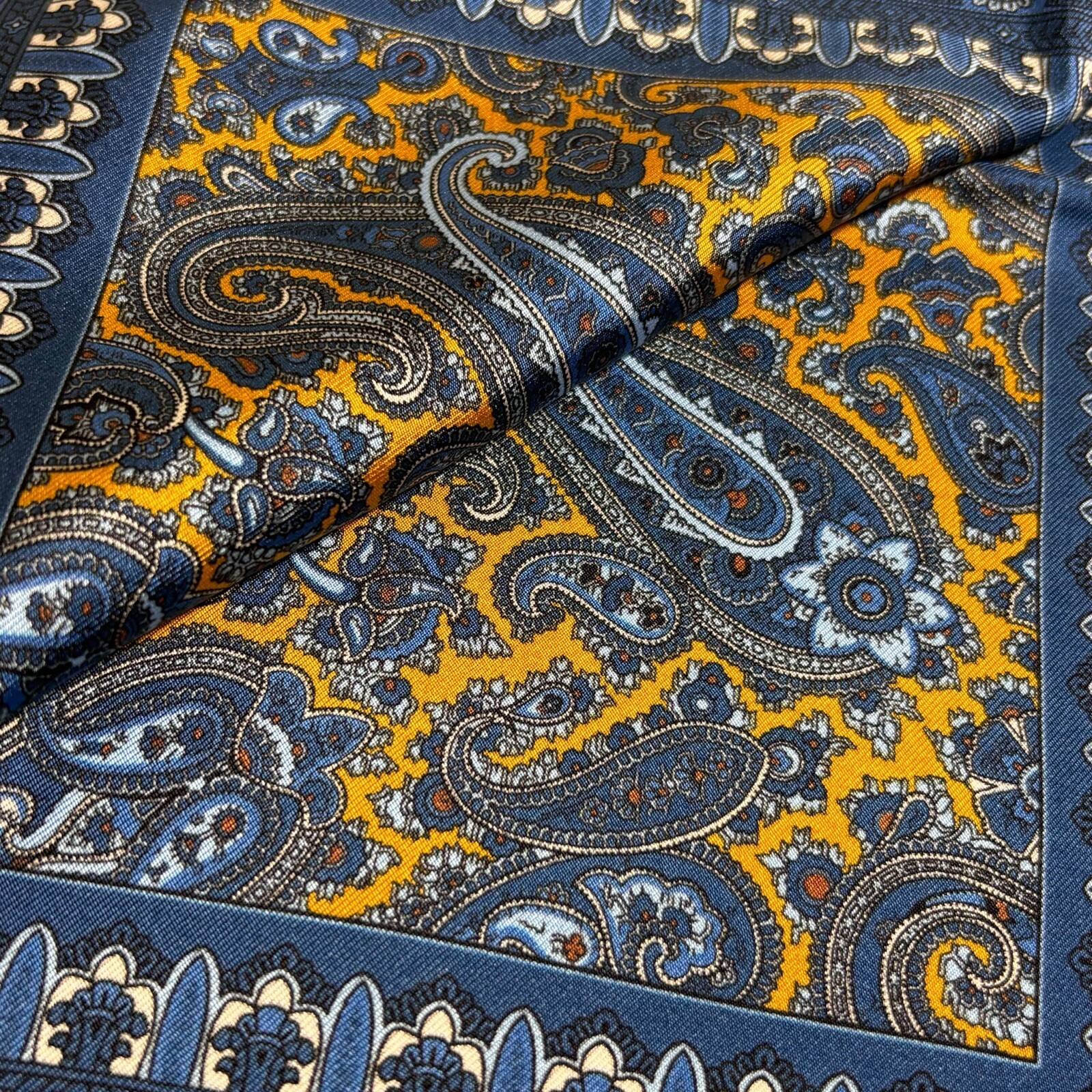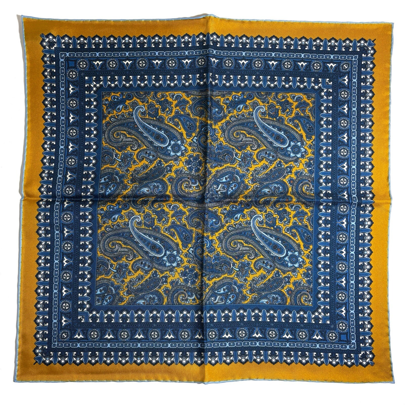 Yellow Blue Paisley Silk Pocket Square Hand-Rolled in England