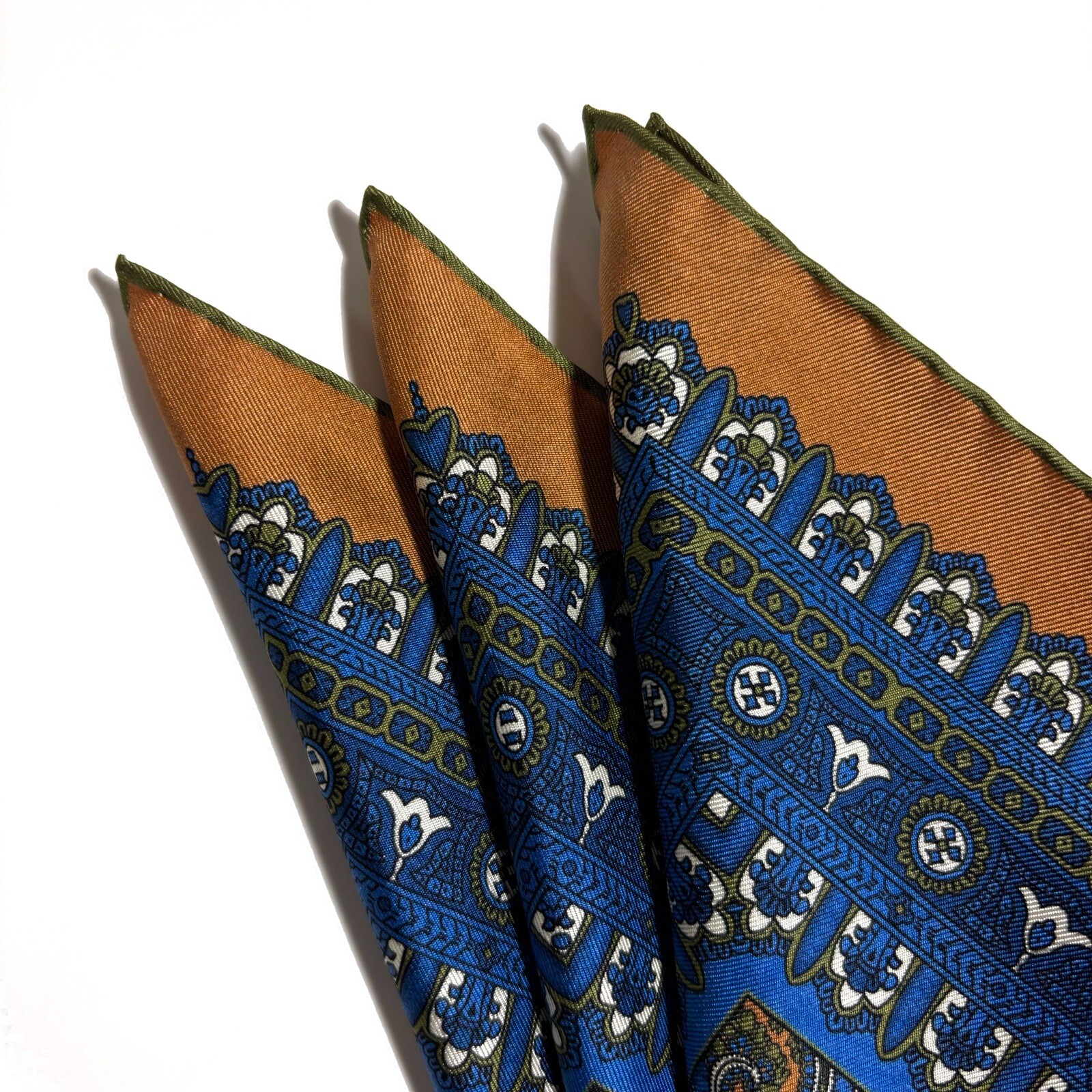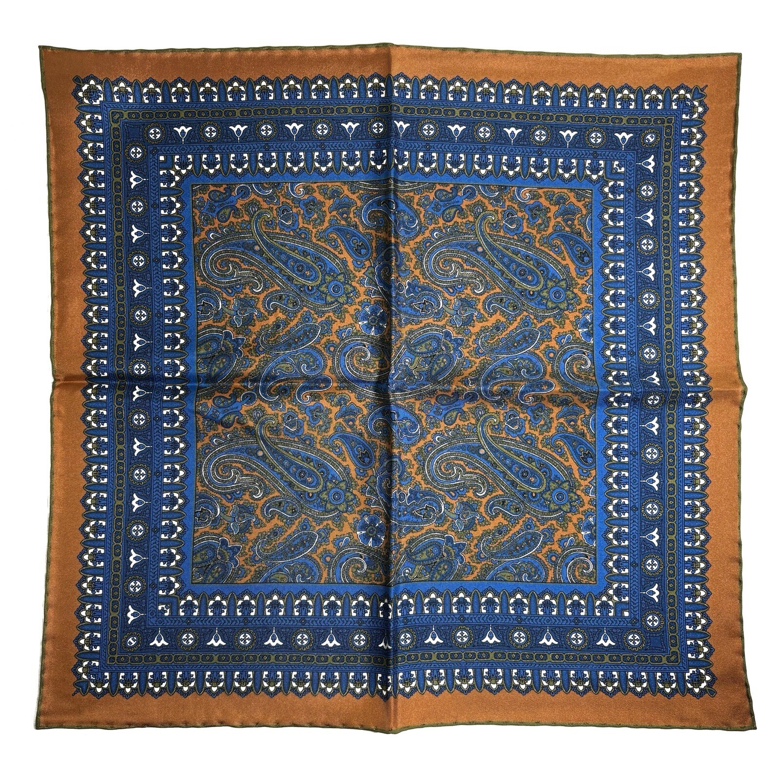 Burnt Orange Blue Paisley Silk Pocket Square Hand-Rolled in England