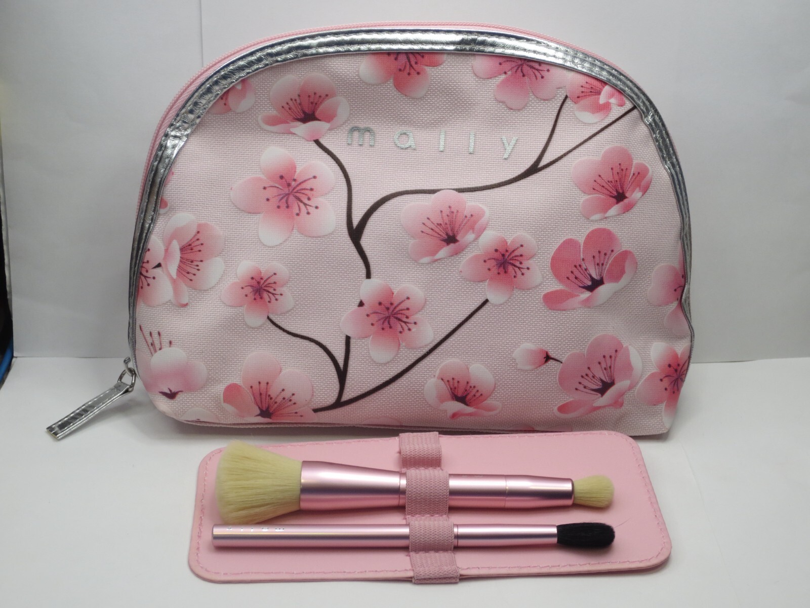 MALLY PINK CHERRY BLOOSOM FLOWER COSMETIC BAG WITH 2 MAKEUP BRUSHES 4 SETS