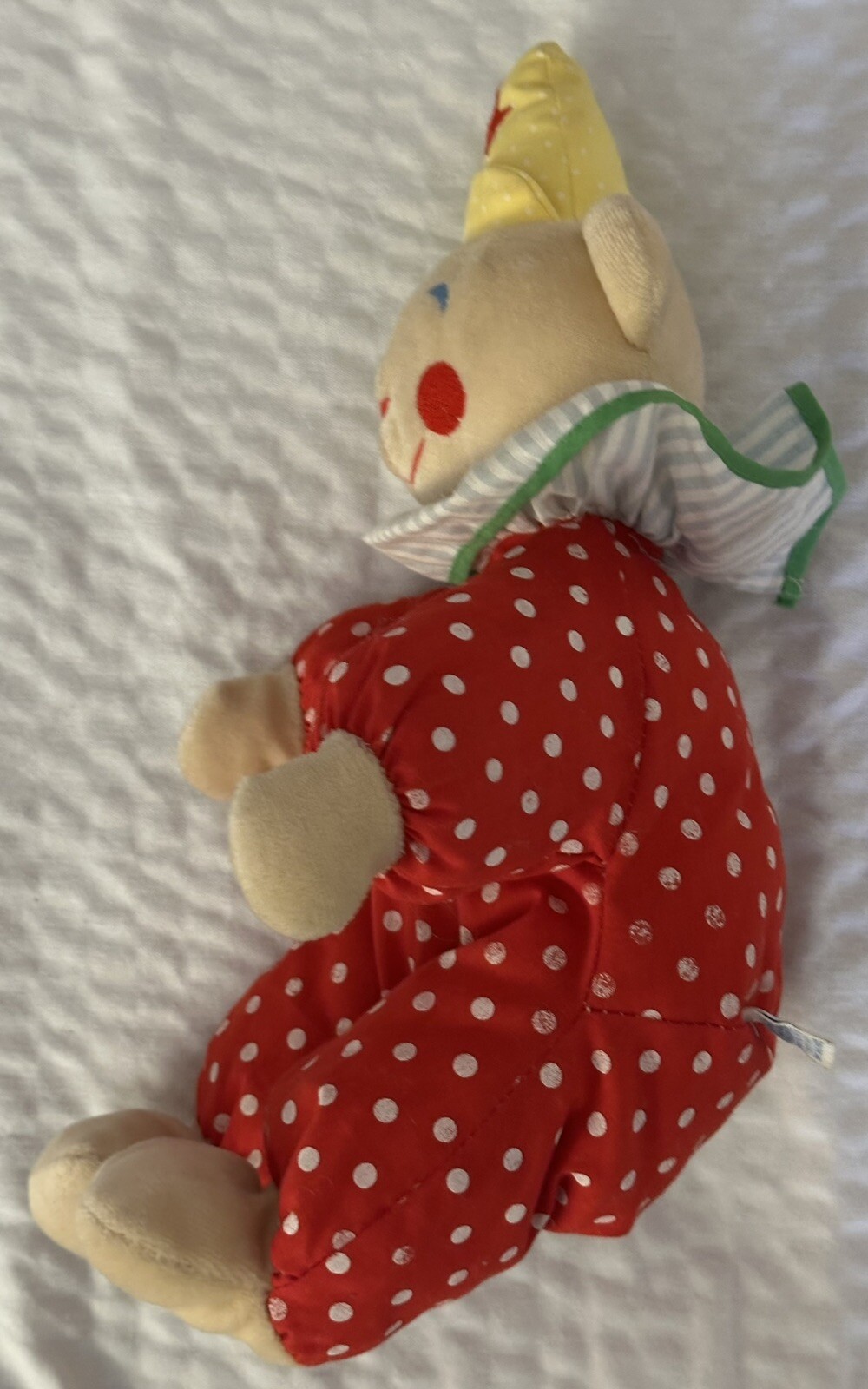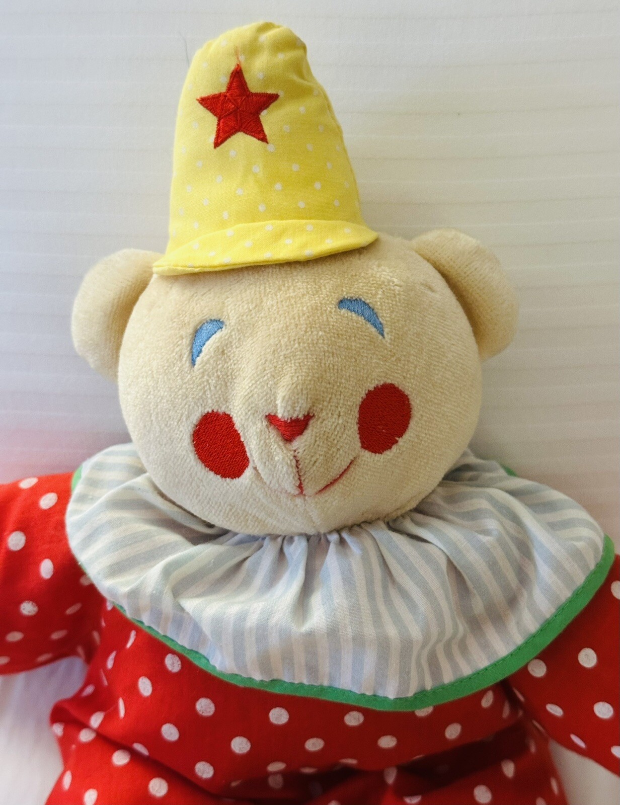 как выглядит Vtg Eden Clown Teddy Bear Plush Doll Red Polka Dots Yellow Hat 13" Stuffed Toy фото