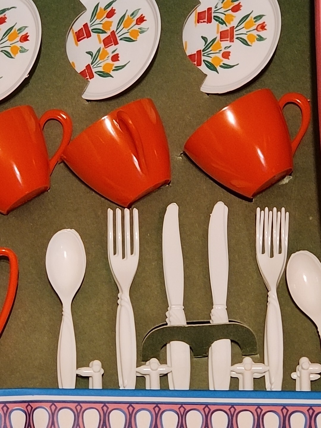 как выглядит Vintage Irwin Toy Tea Set Flower Cart Red Cups Saucers Plates Utensils Kettle фото