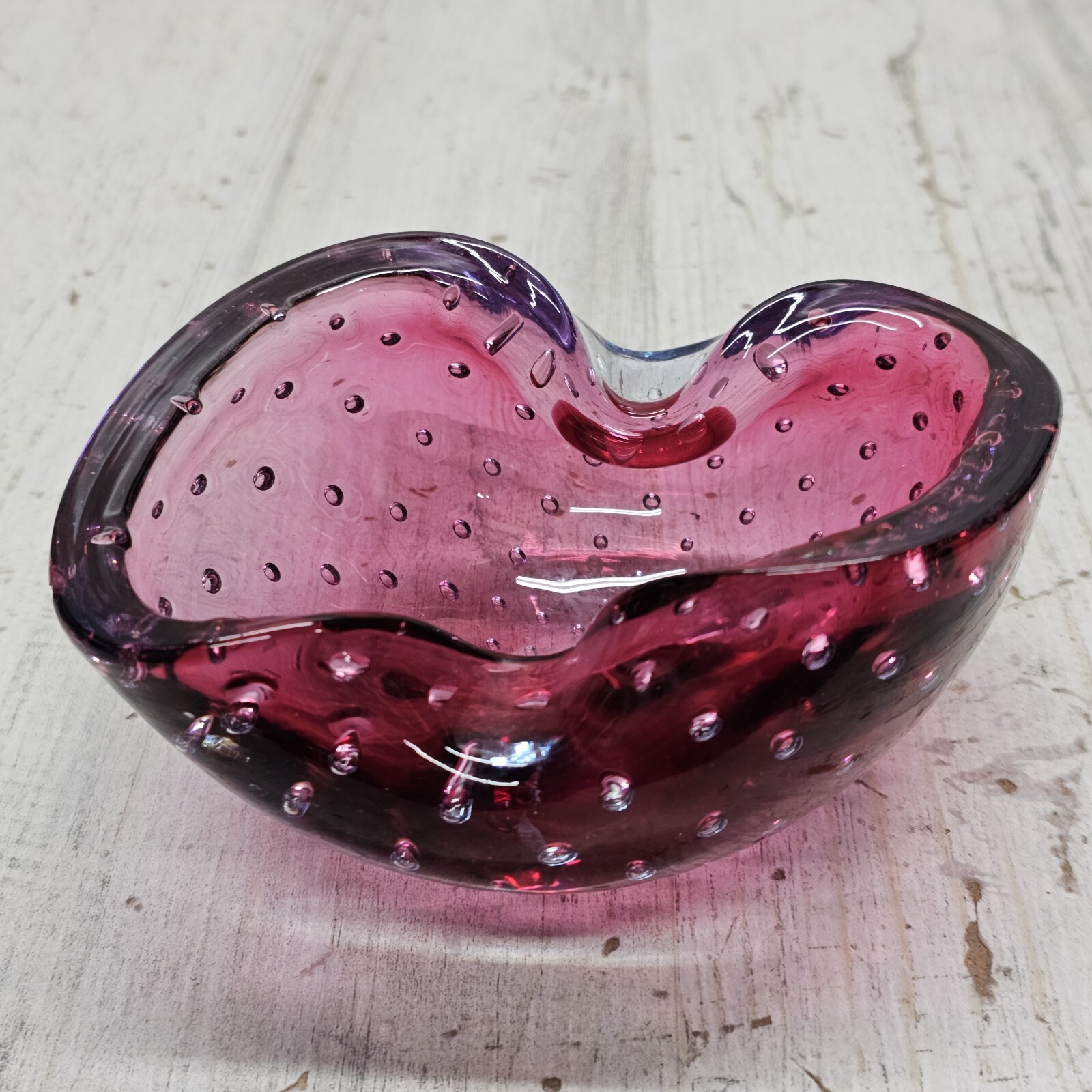 Murano Bullicante Controlled Bubble Art Glass Ashtray Cranberry and Amethyst MCM