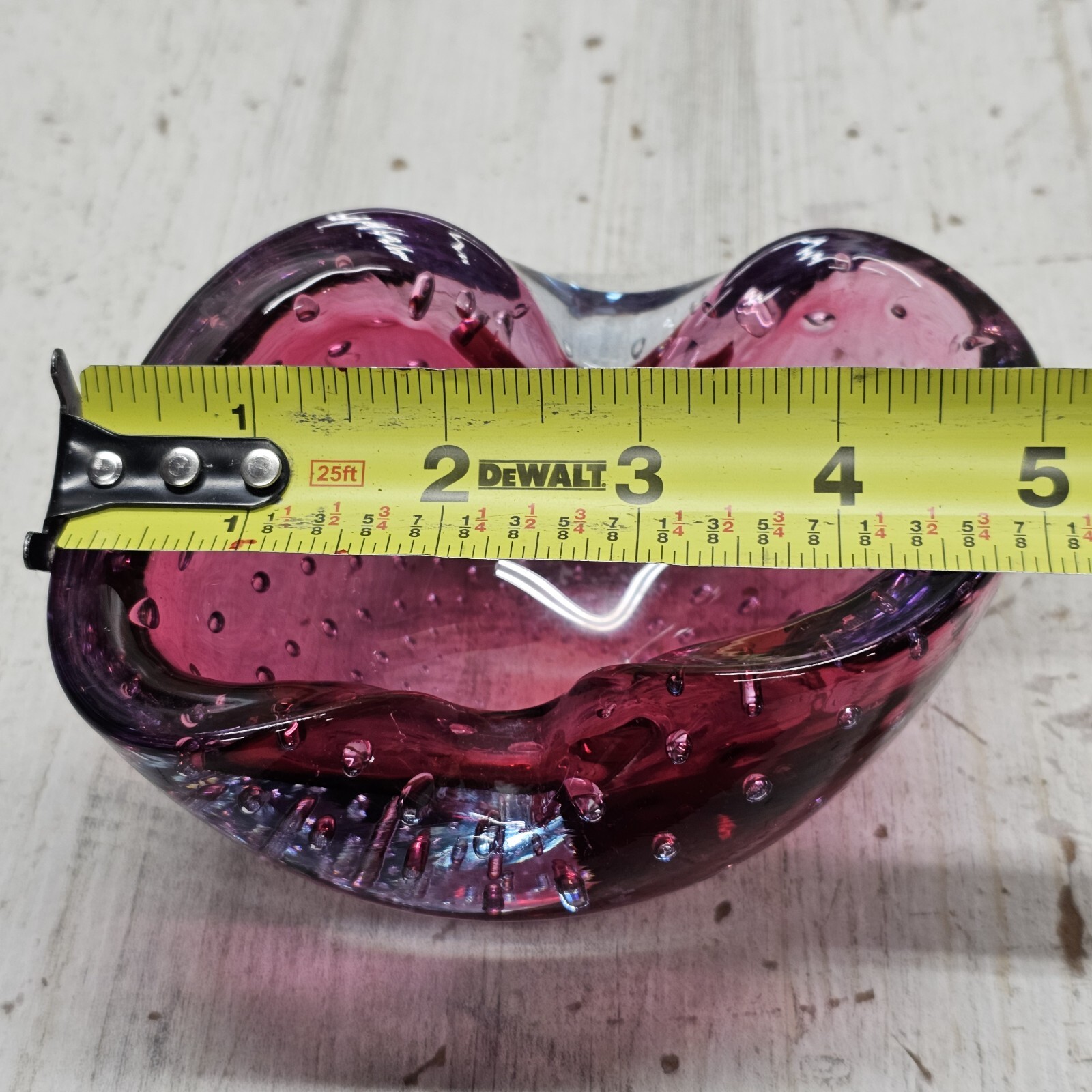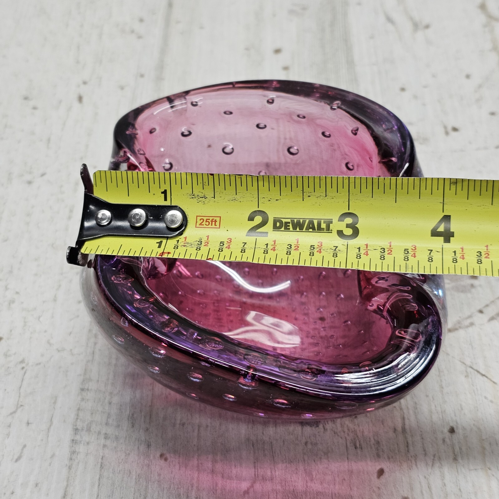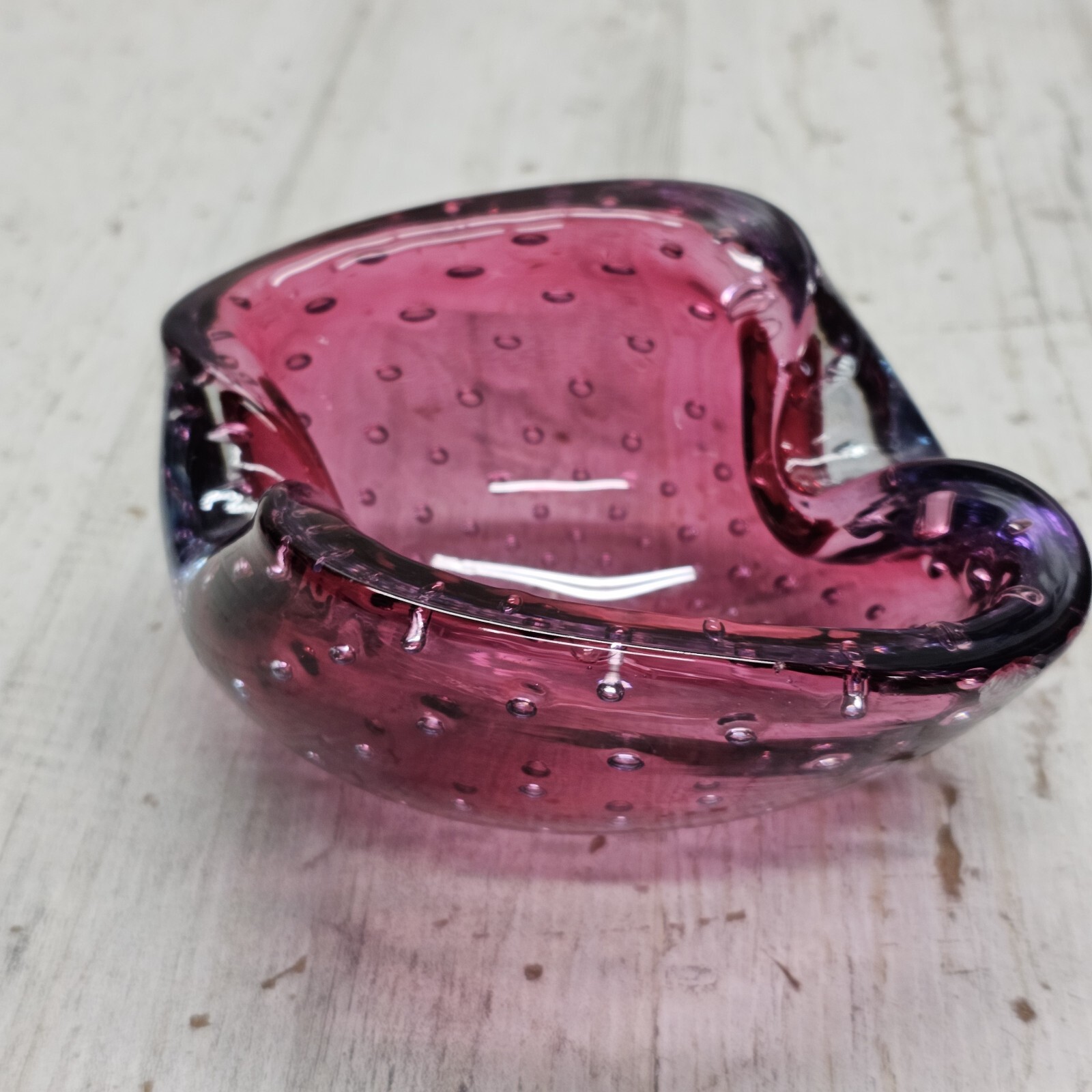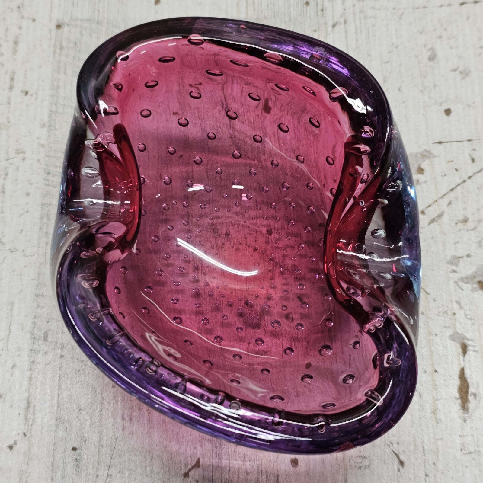 как выглядит Murano Bullicante Controlled Bubble Art Glass Ashtray Cranberry and Amethyst MCM фото