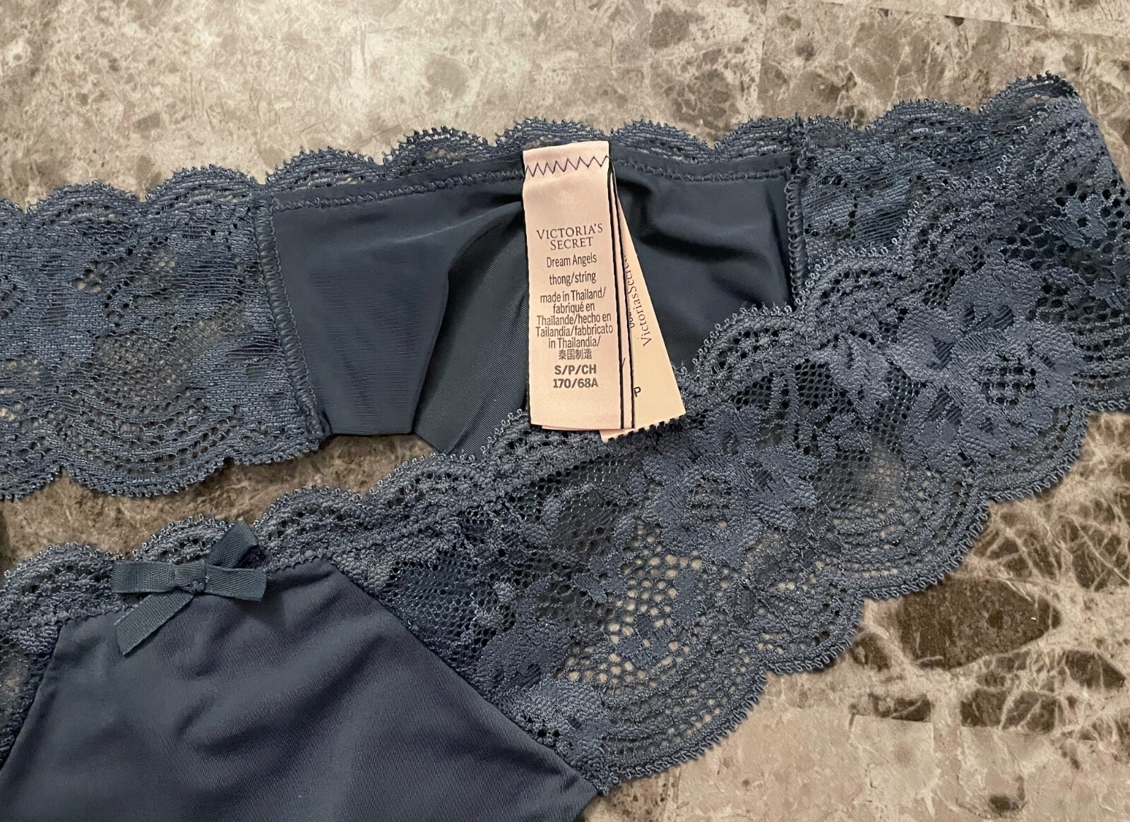 как выглядит NWT VICTORIAS SECRET DREAM ANGELS S GRAY BLUE SMOOTH FLORAL LACE THONG PANTIES фото