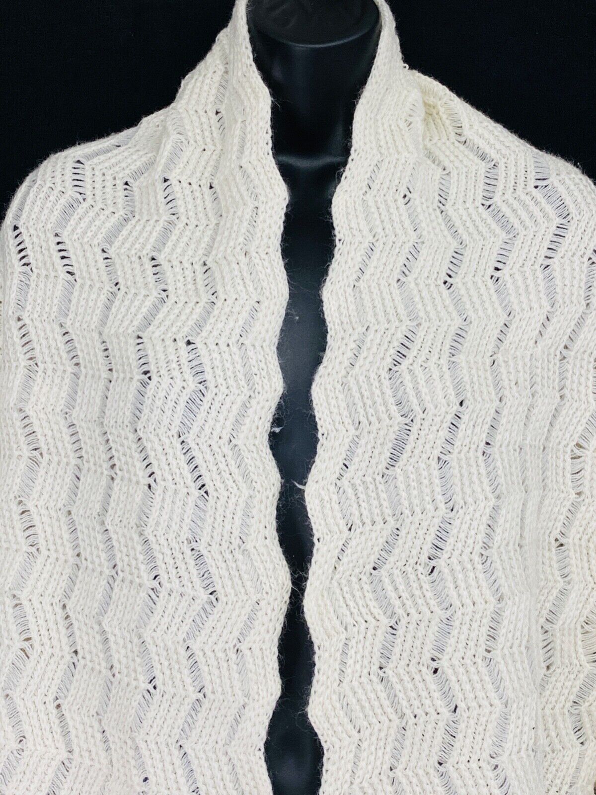 как выглядит Vintage white fringed shawl, chevron knit boho wedding wrap soft lightweight фото