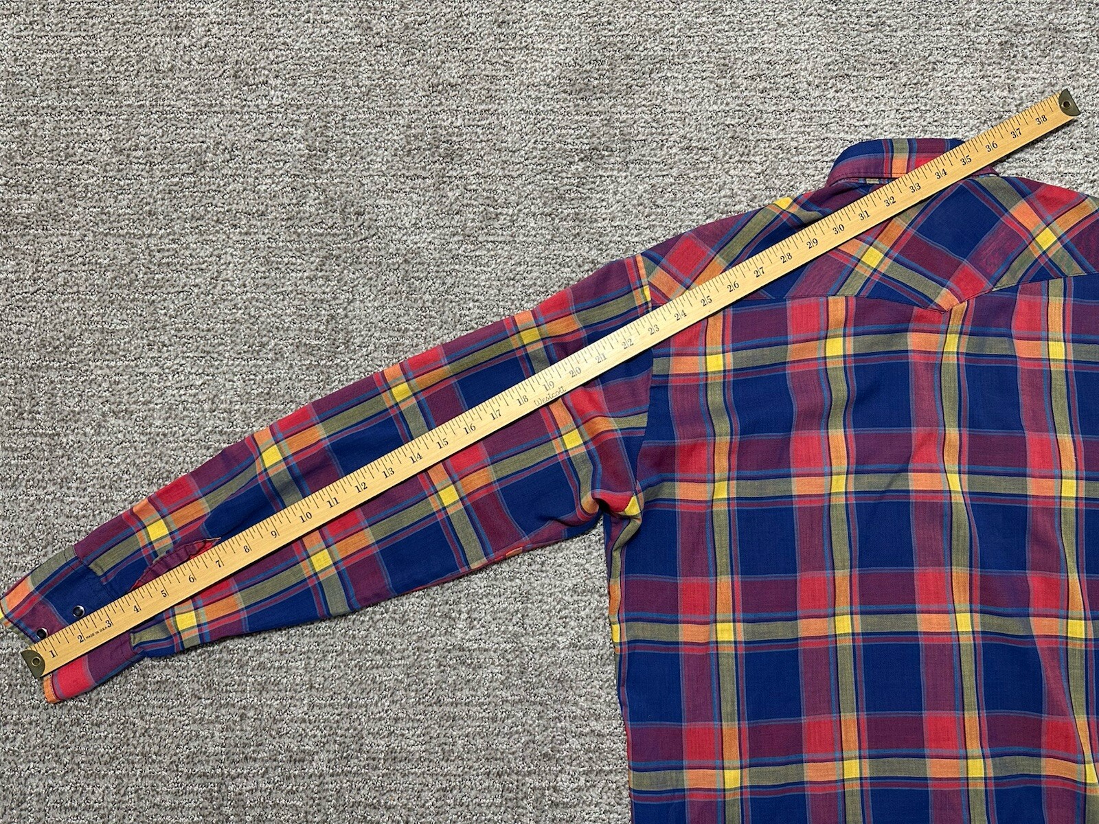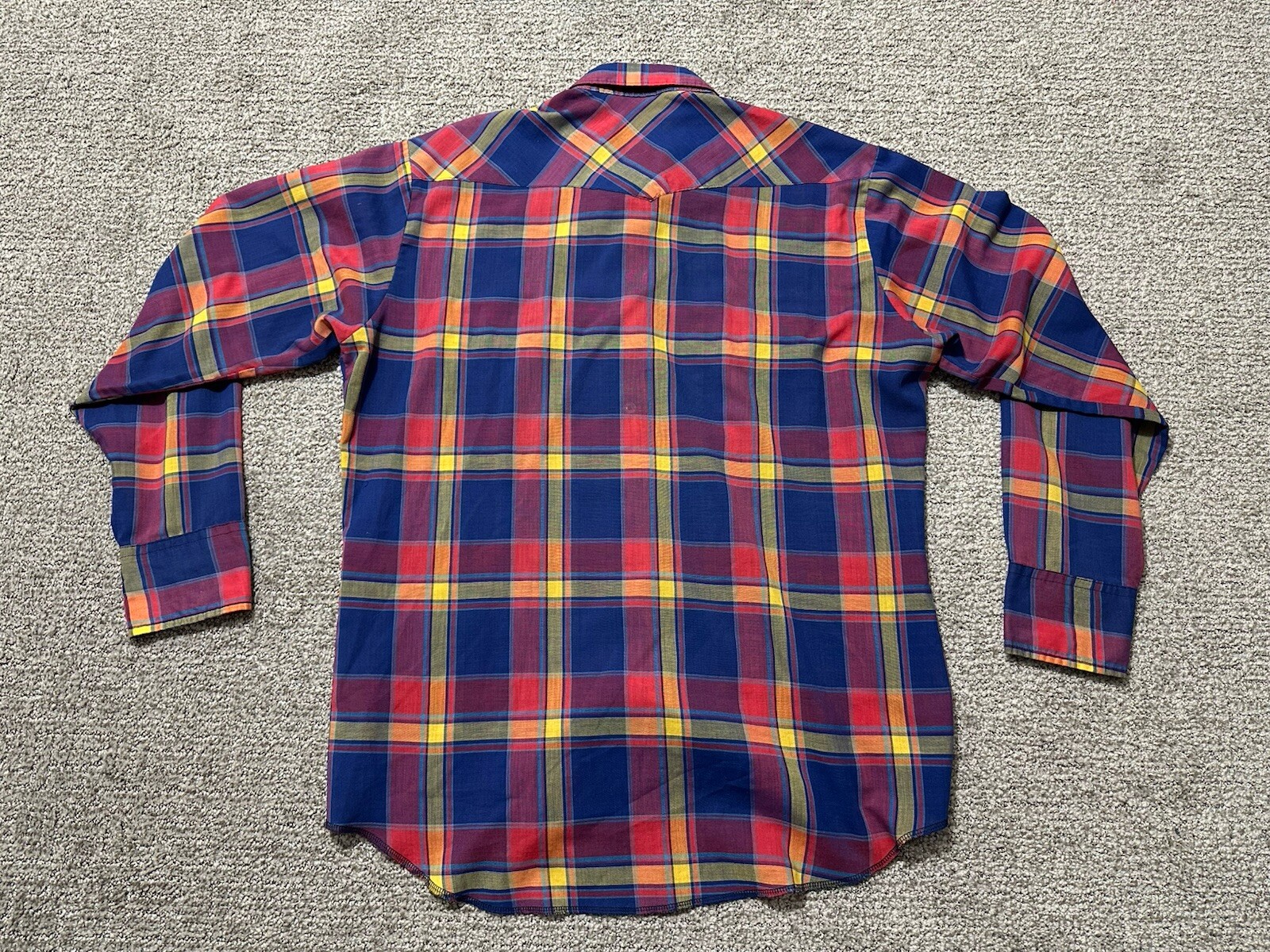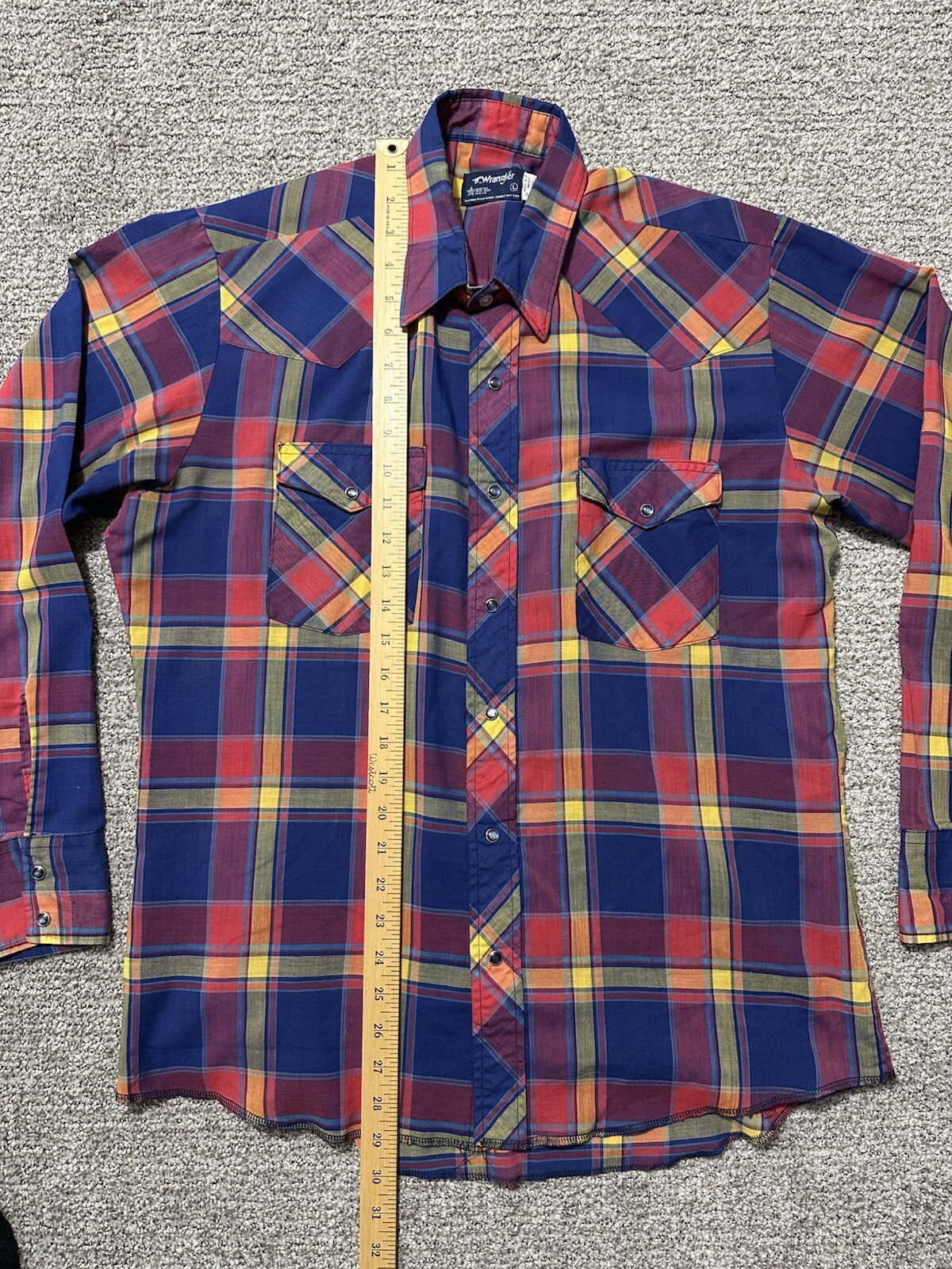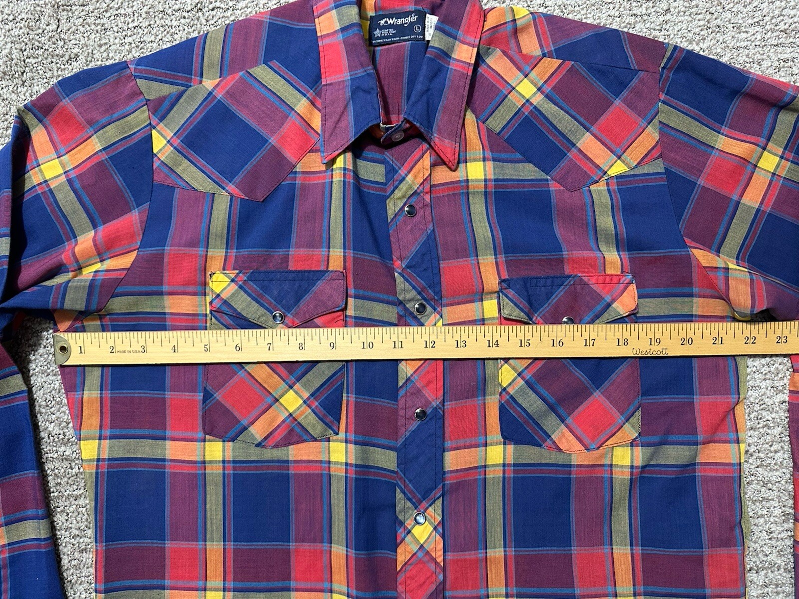 как выглядит Vintage 80s Wrangler Red Blue Plaid Pearl Snap Western Shirt Mens L USA фото