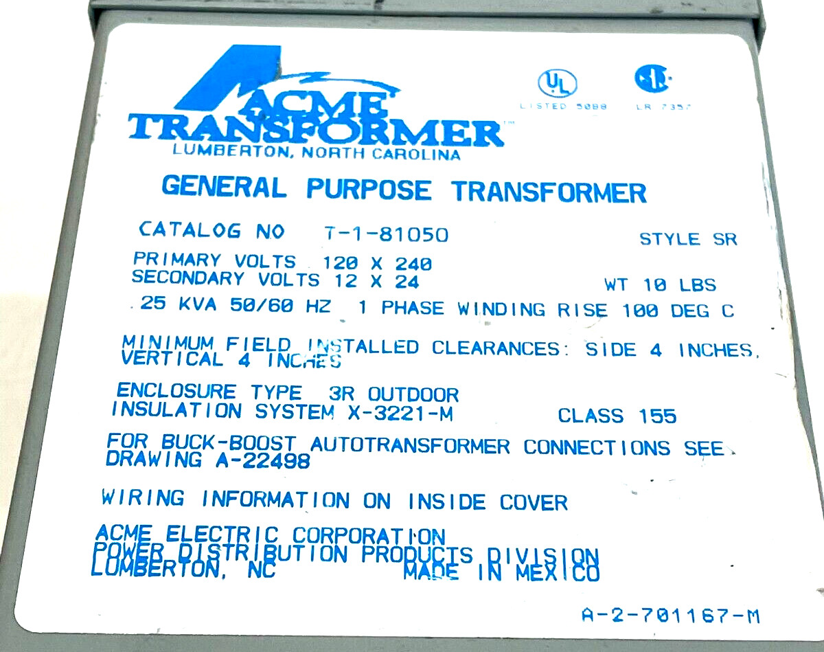 USED ACME ELECTRIC T-1-81050 GENERAL PURPOSE TRANSFORMER T181050