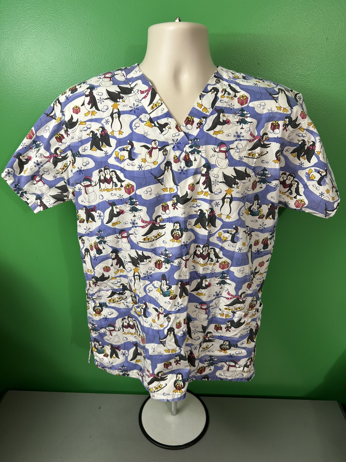 как выглядит PENGUIN SNOWMAN Winter Themed Scrub Top Large White Christmas Holiday фото