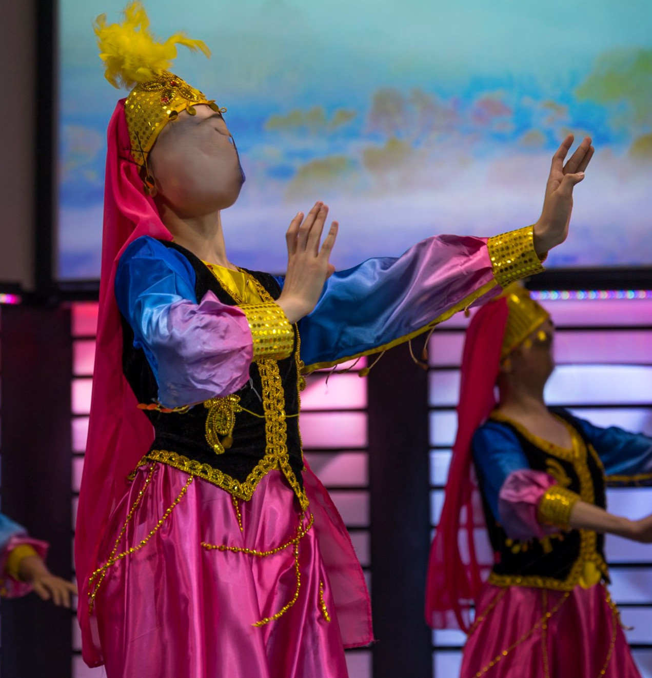 Persian folk dance dress in pink/blue with a crown, scarf, and black velvet vest