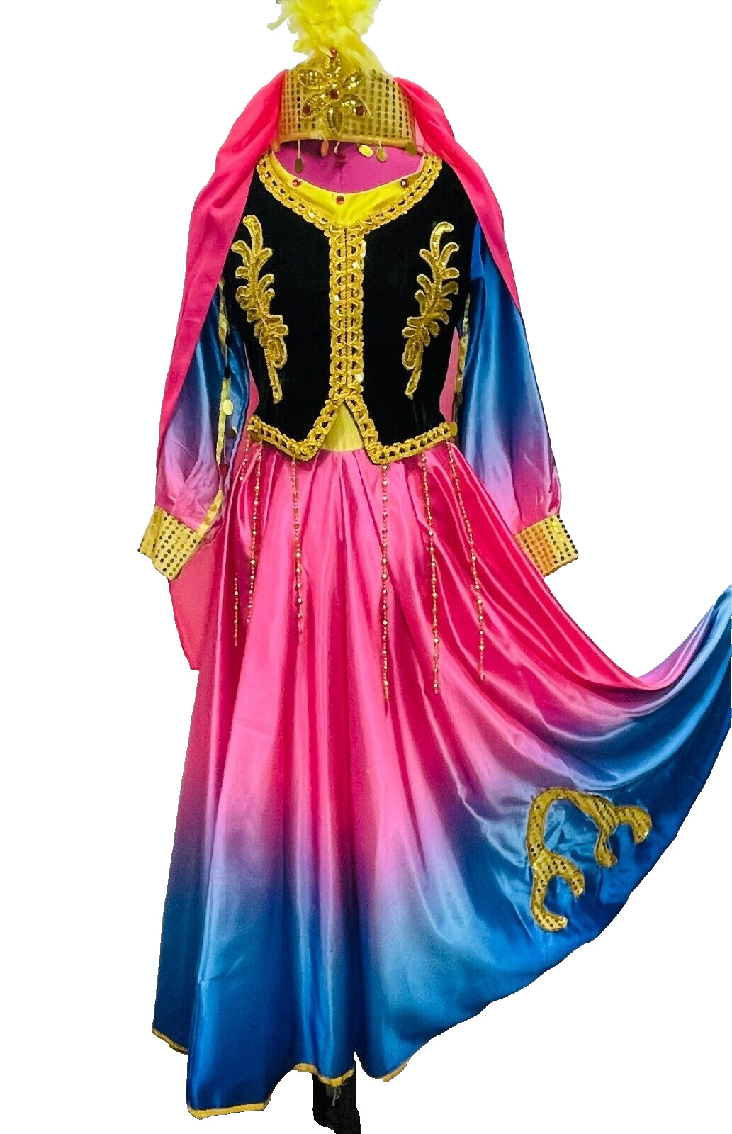 как выглядит Persian folk dance dress in pink/blue with a crown, scarf, and black velvet vest фото