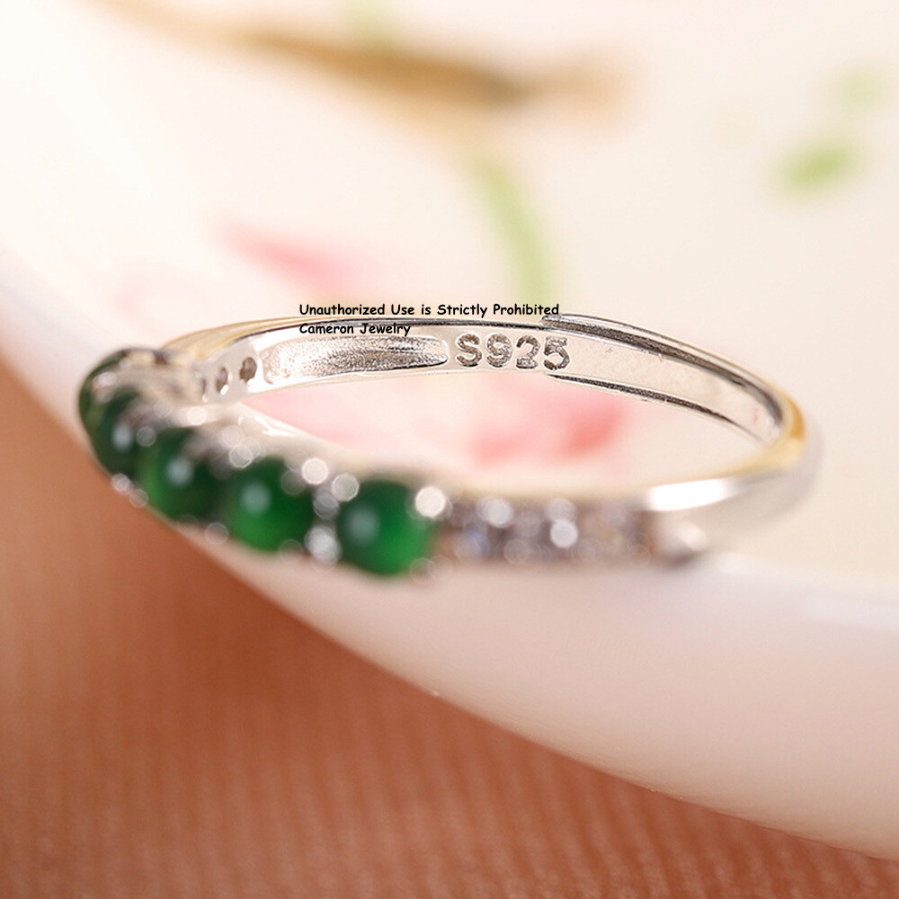 Pure S925 Sterling Silver Natural Jade Jadeite Lucky Beads Open Ring us:6-9