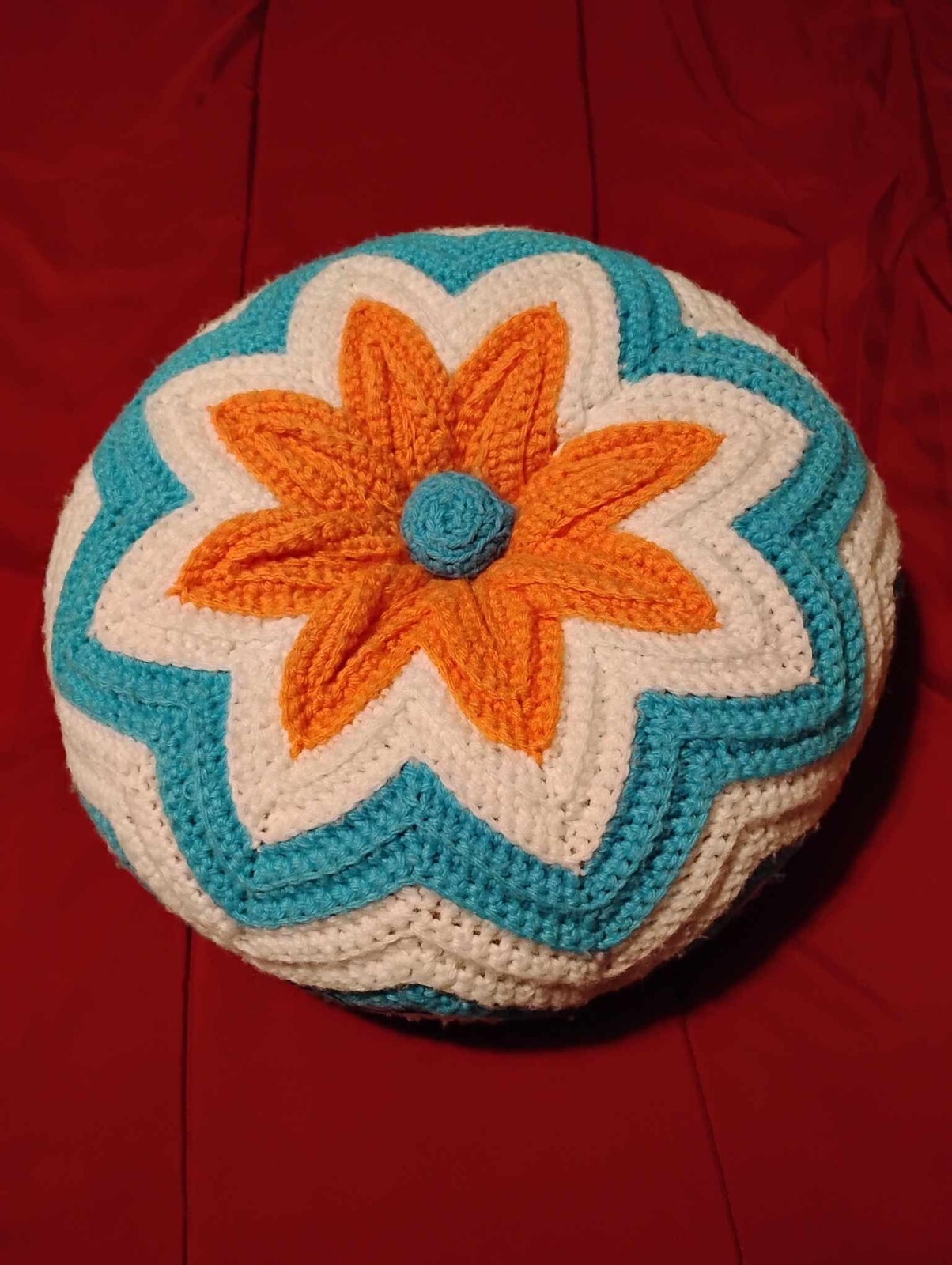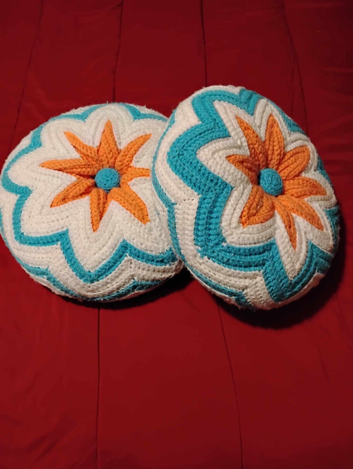 Set of 2 Pillows round handmade crochet Blue/white/orange 12 in