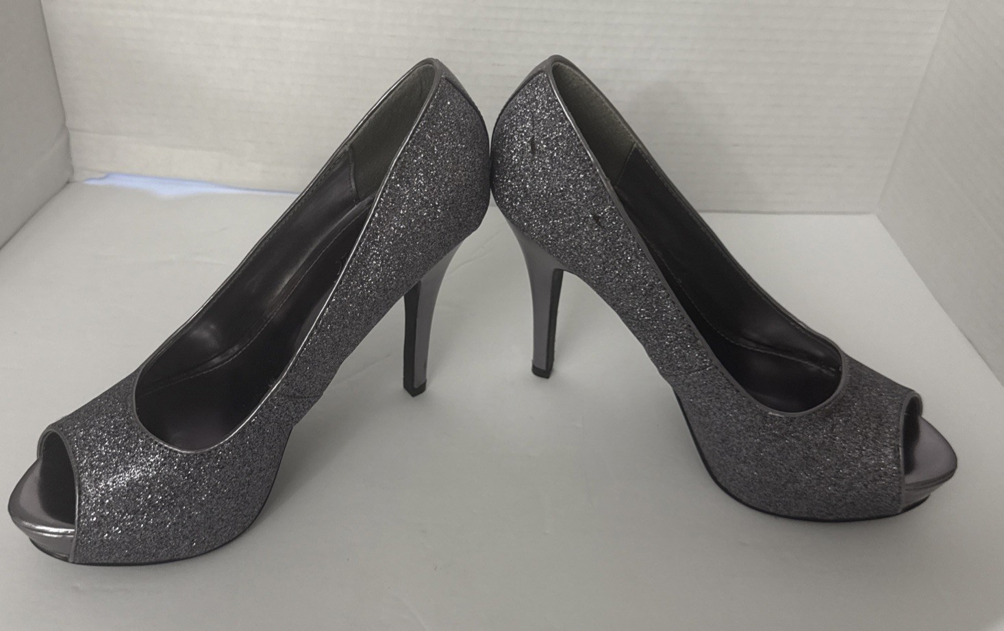 как выглядит Jacqueline Ferrar Women Silver Sparkle Glitter Peep Toe Heels Platform Size 7M фото