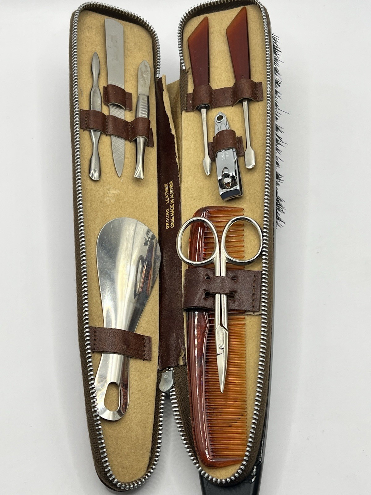 Manicure Set 10 Piece Clothes Brush Shoe Horn Comb Ground Leather Case Austria
