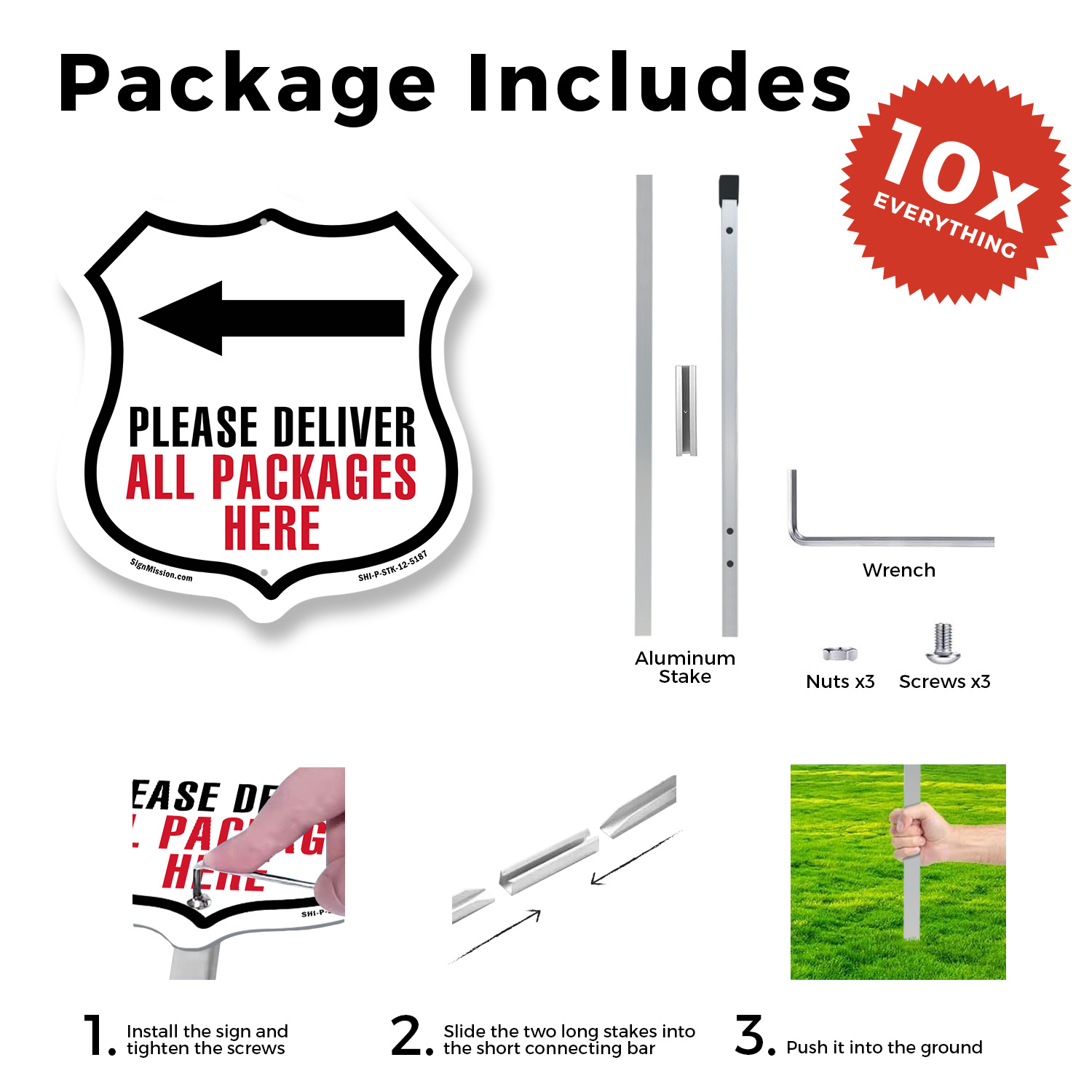 Please Deliver All Packages Here Left Shield Shaped Sign With Stake