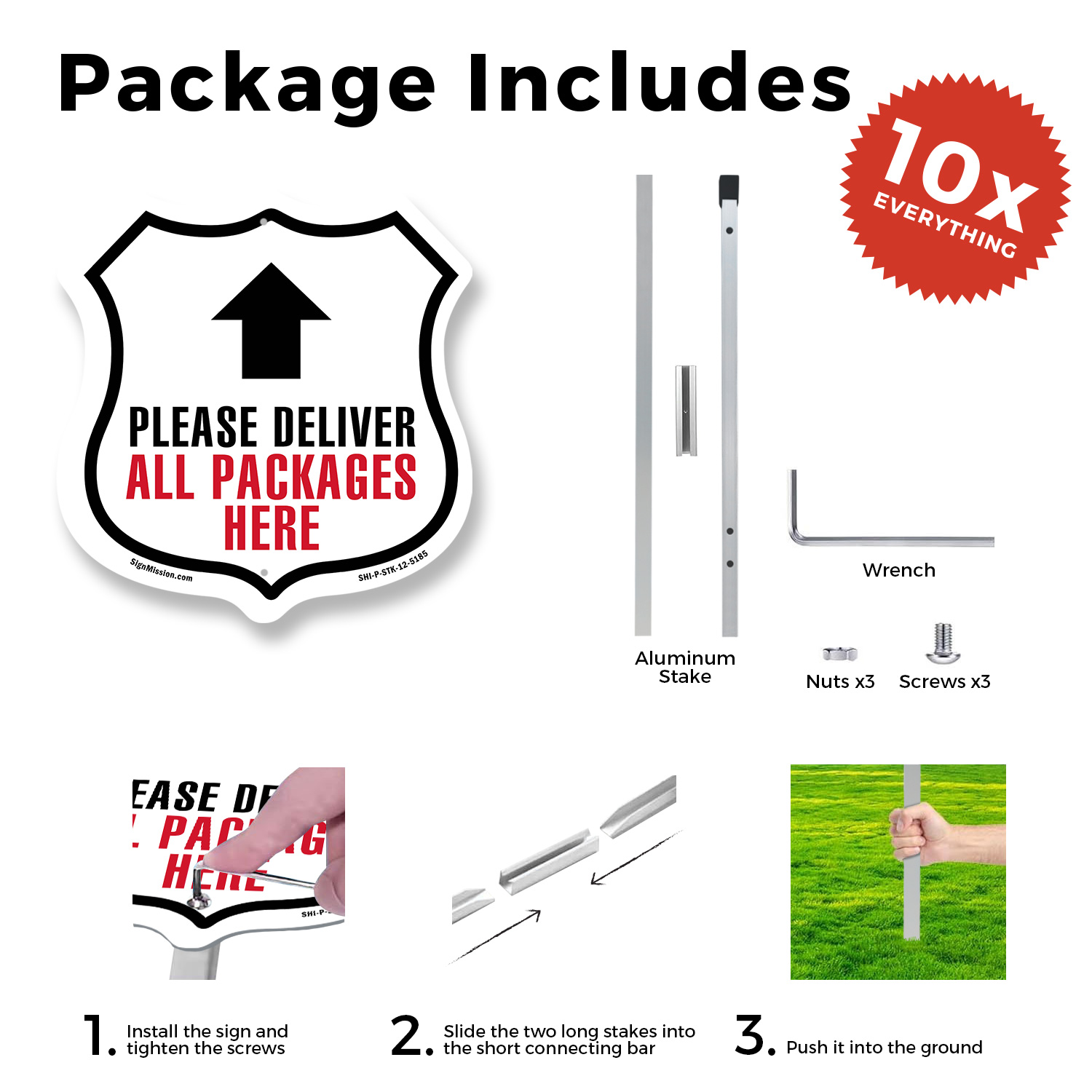 Please Deliver All Packages Here Up Shield Shaped Sign With Stake