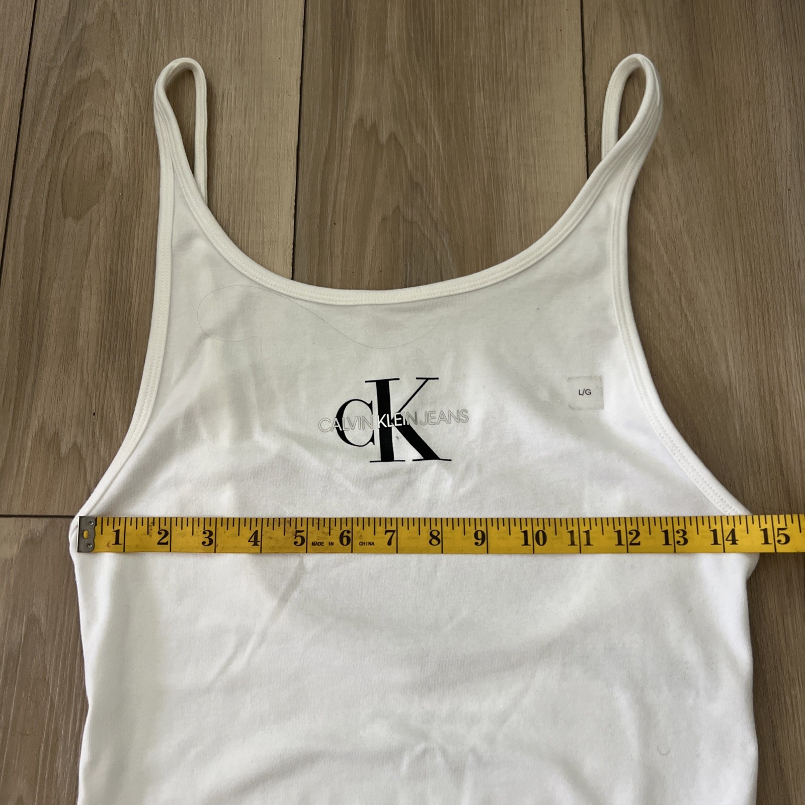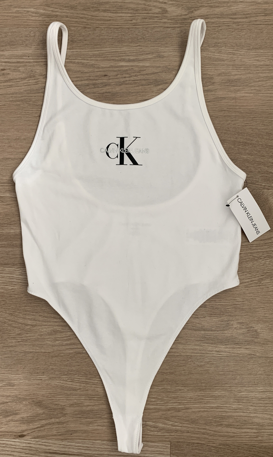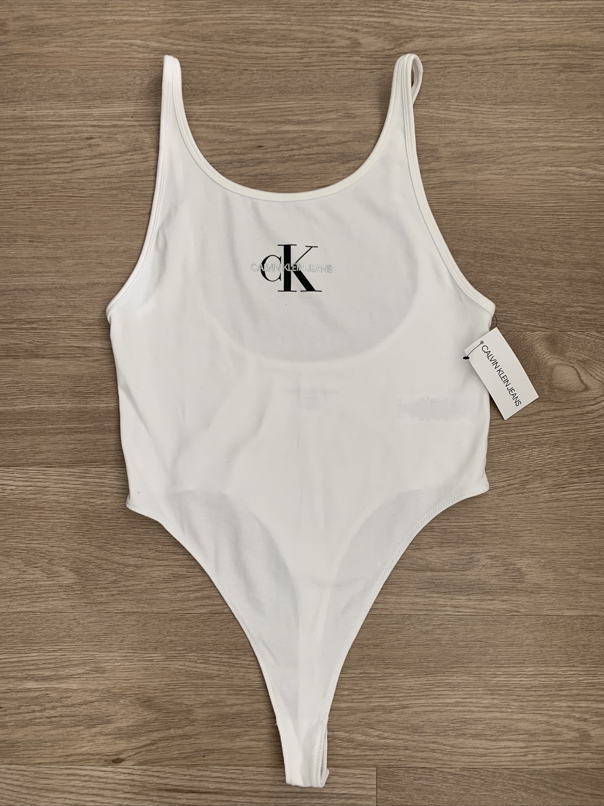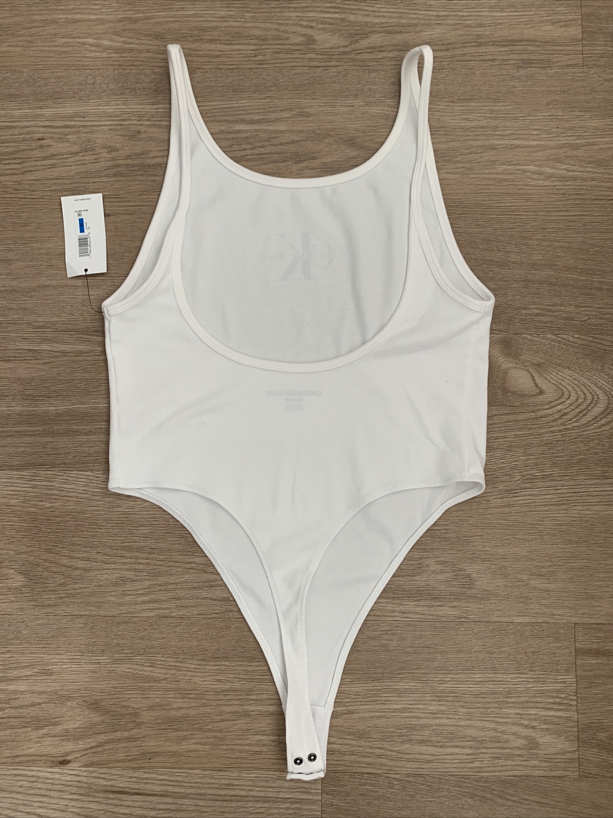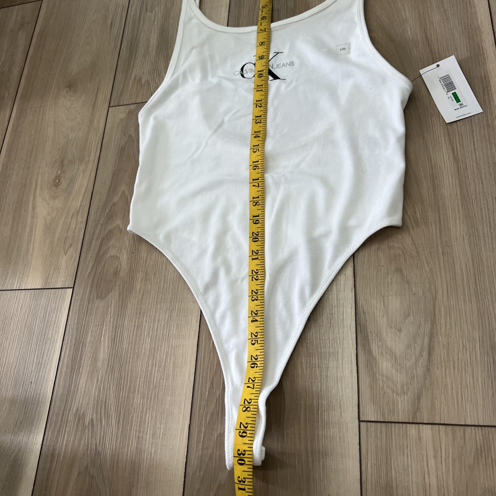 как выглядит CALVIN KLEIN Jeans Womens CK Monogram Logo Scoop Back Bodysuit White Size L фото