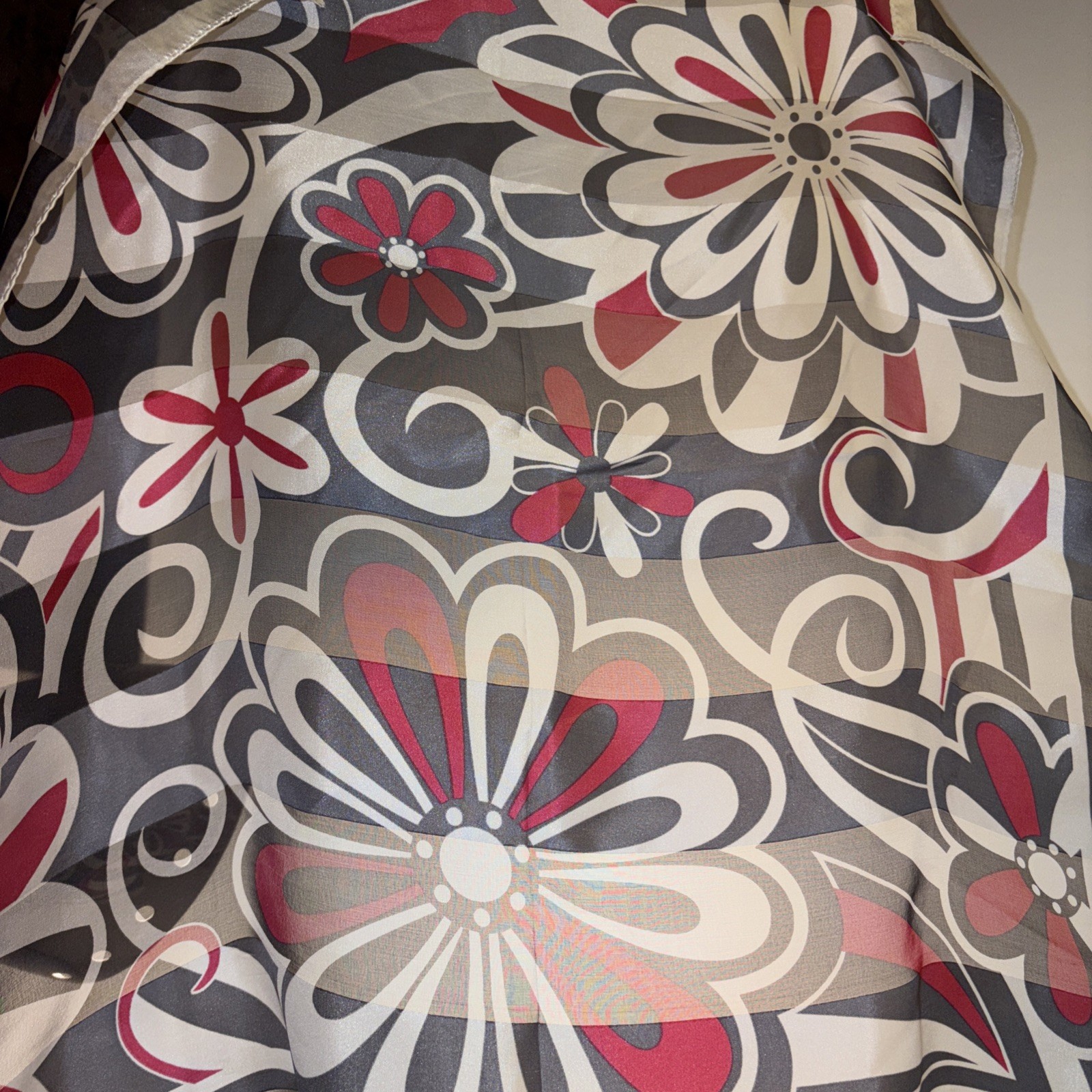 Anne Klein Silk Scarf 20.5 Square Red Grey Floral Chiffon Striped