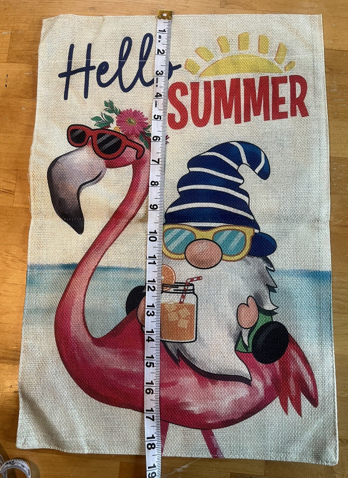 как выглядит HELLO SUMMER GARDEN FLAG NYLON 12"X18" "GNOME ON FLAMINGO" BEACH HOUSE DECOR фото