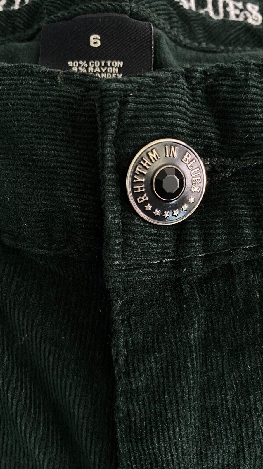 NWT green corduroy pants RHYTHM IN BLUES skinny stretch dark forest vintage 6