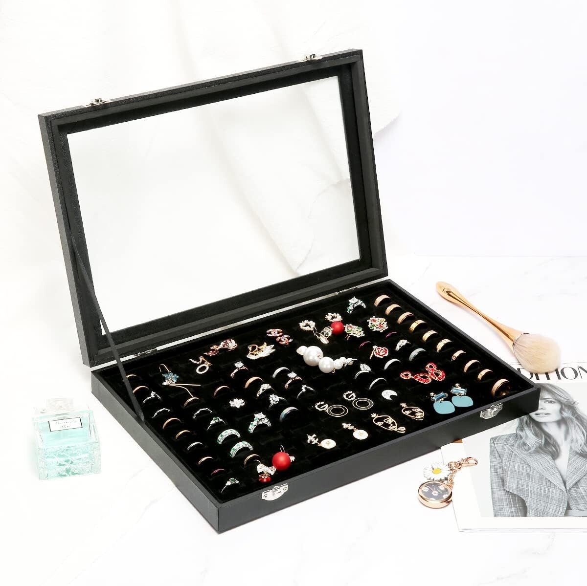 100 Slot Velvet Ring Display Case with Transparent Lid Jewelry Organizer Tray