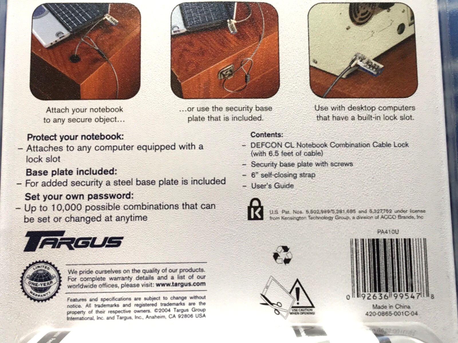 Targus Defcon CL Notebook Combination Lock Attaches NB Lock Slot Security