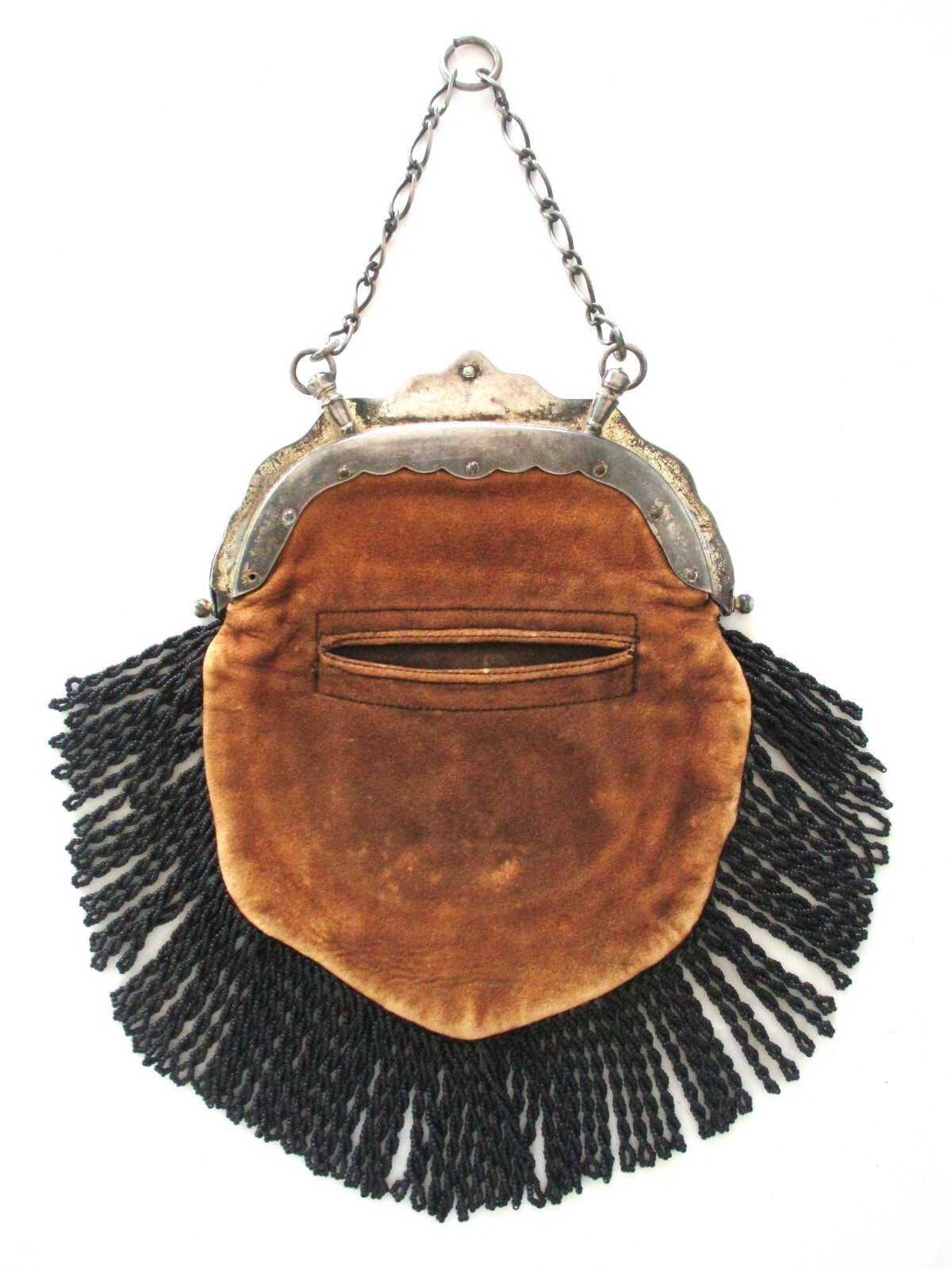 как выглядит Antique, SILVER REPOUSSE, CHATELAINE PURSE, BLACK BEADED BODY FRINGE. WOW фото