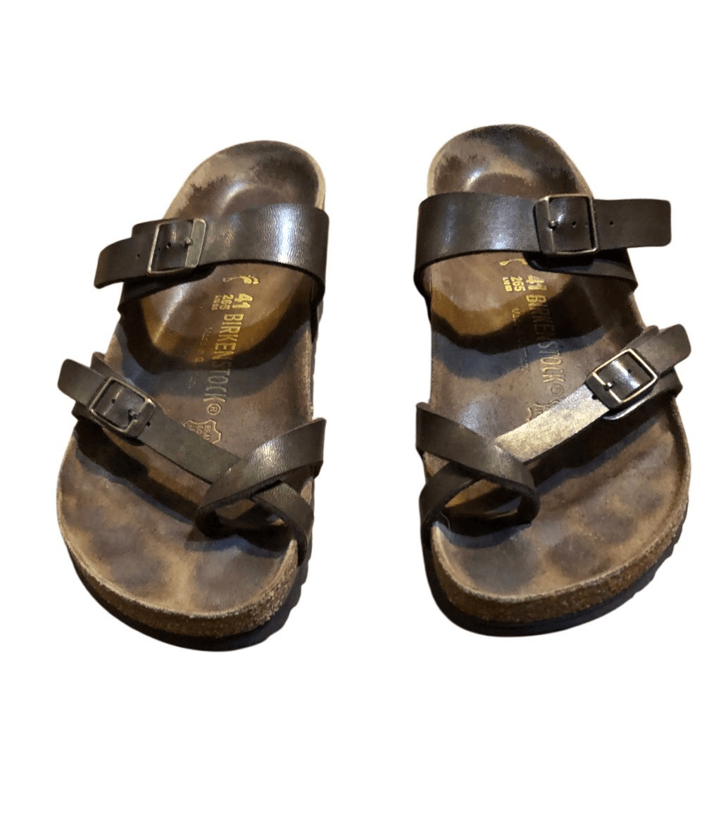 The Birkenstock Mayari sandal features a toe loop and synthetic Birko-Flor upper