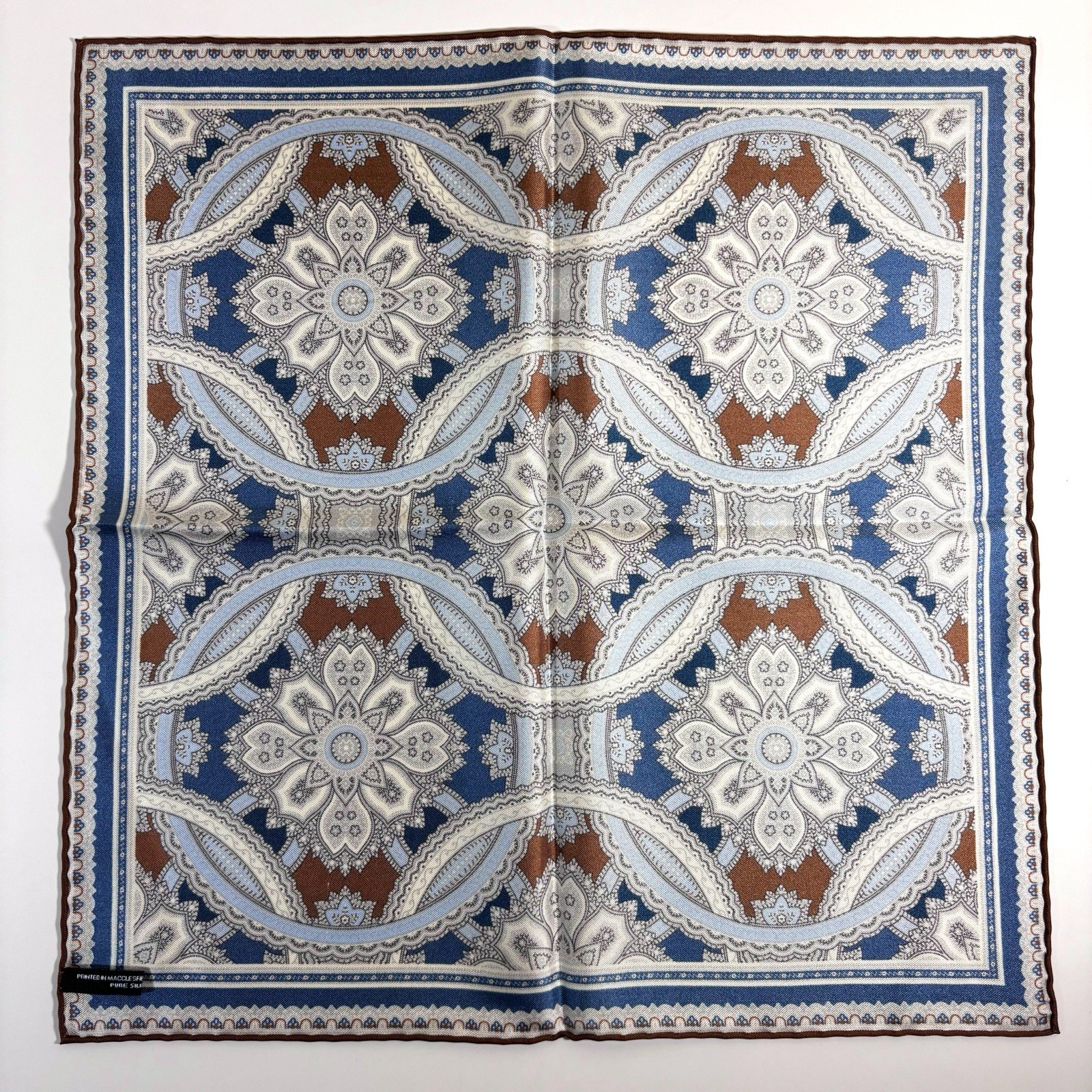 Brown Blue Large Medallion Silk Pocket Square Hand-Rolled in England