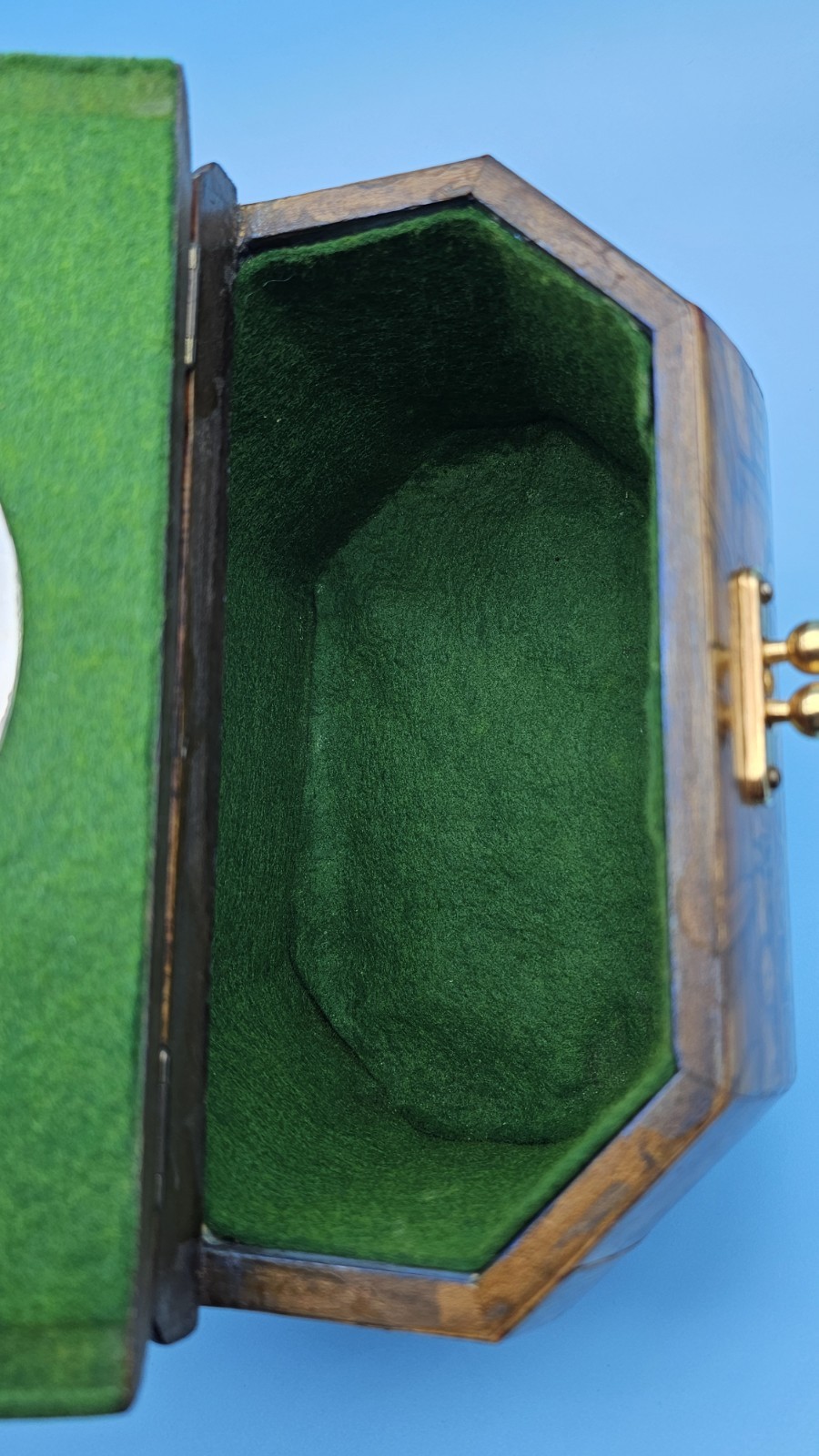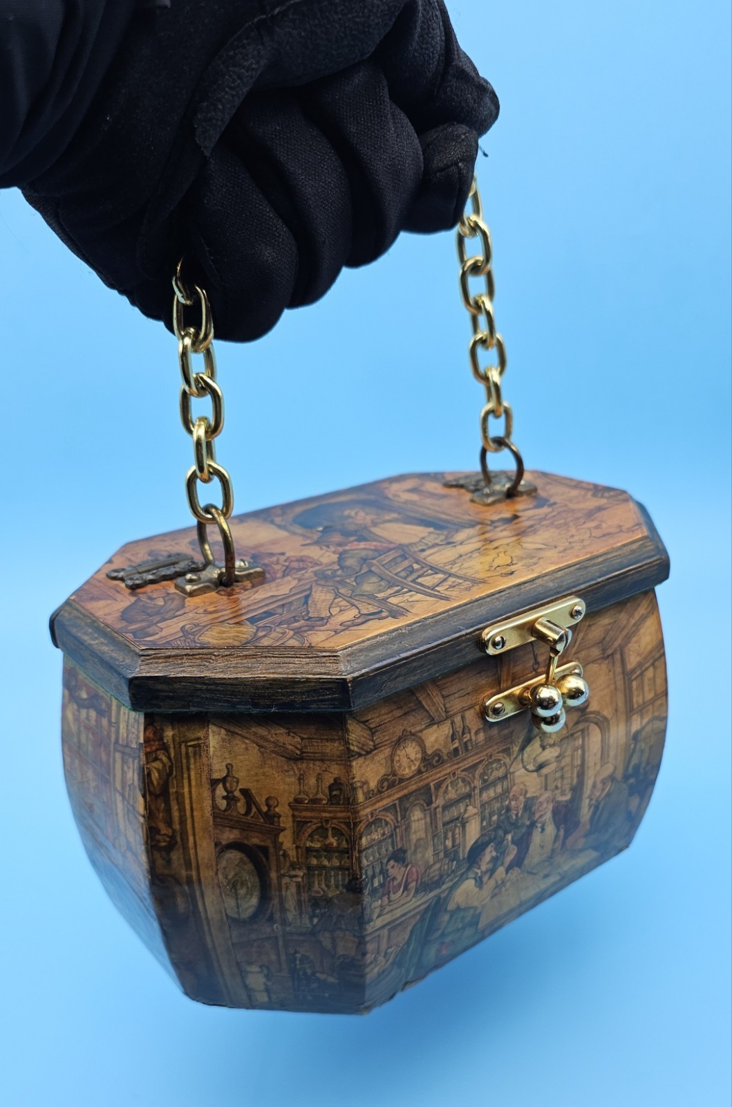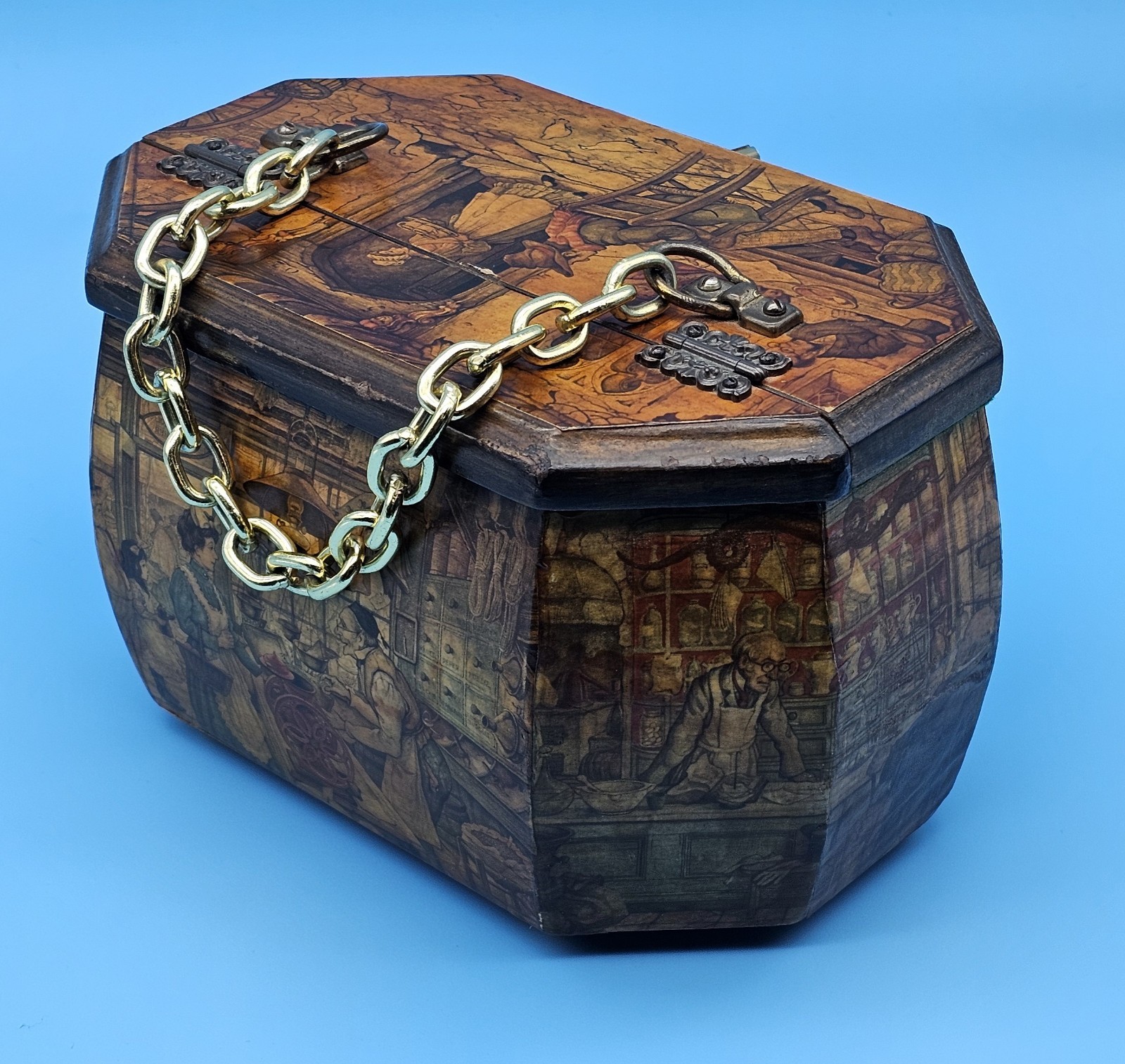 как выглядит Vintage Anton Pieck Wooden Decoupage Octagon Box Purse w/ Chain Exc Condition фото