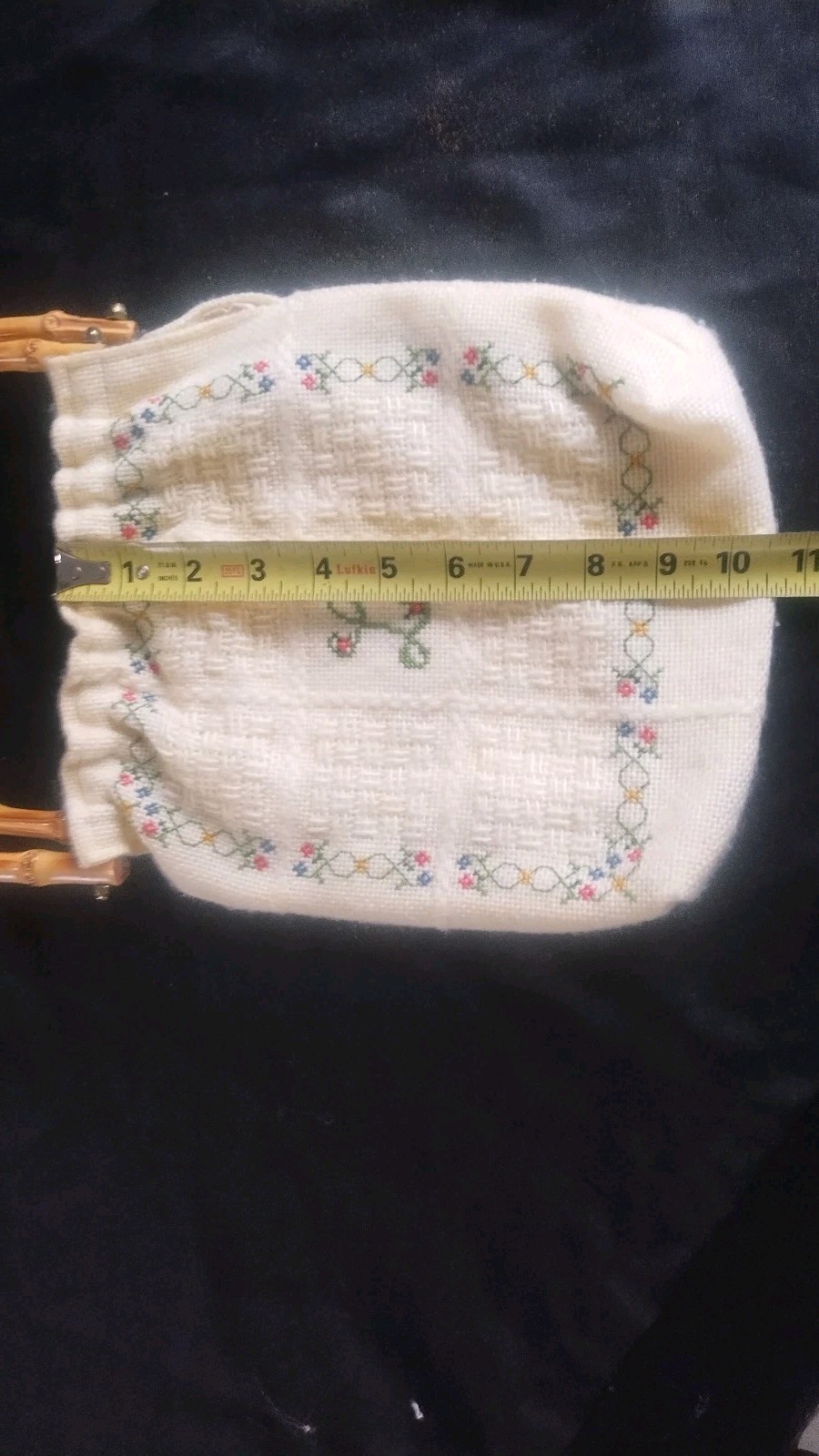 как выглядит Vtg Knit Embroidered White Purse Featuring Initial "L" Bamboo Handles Floral фото