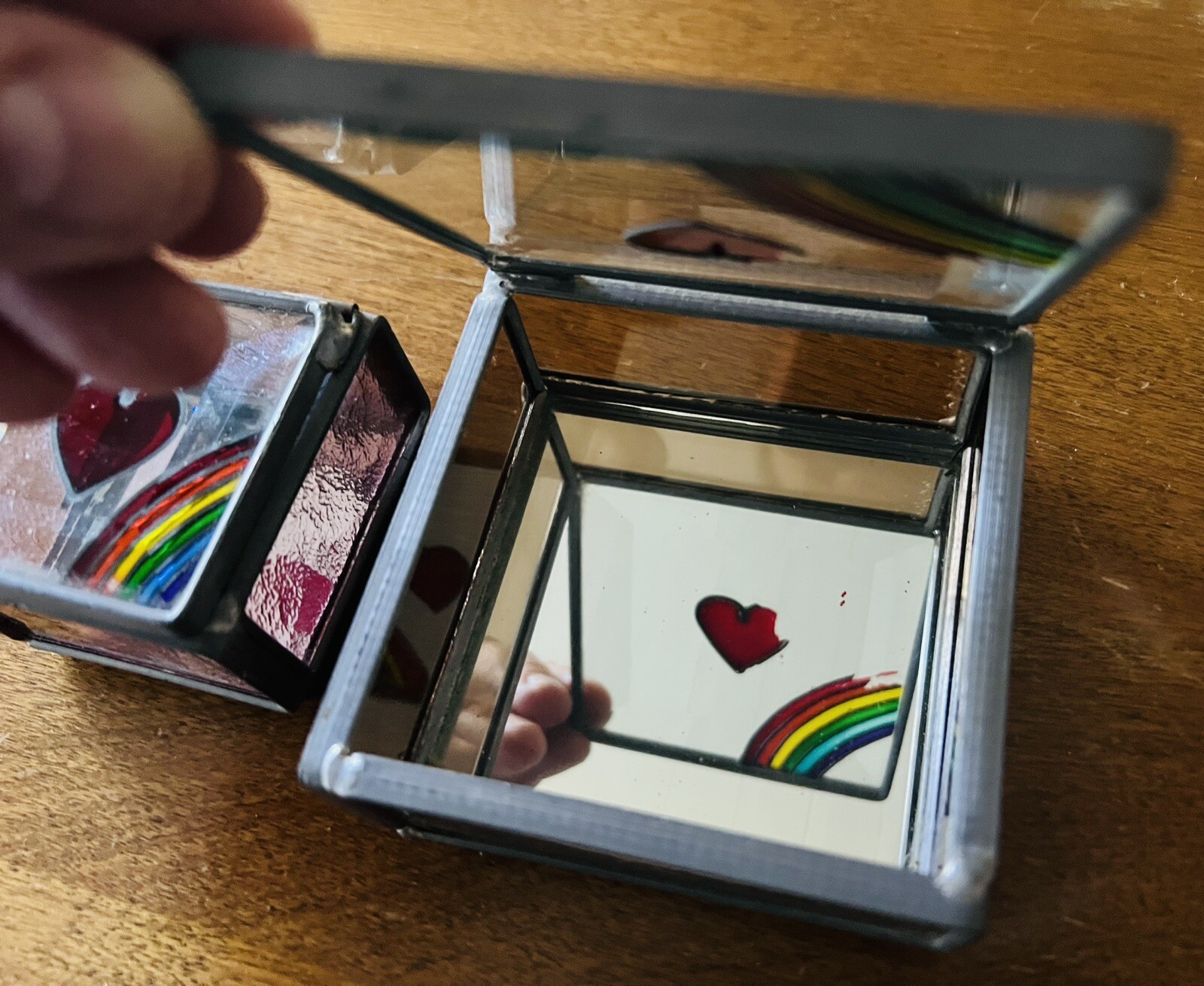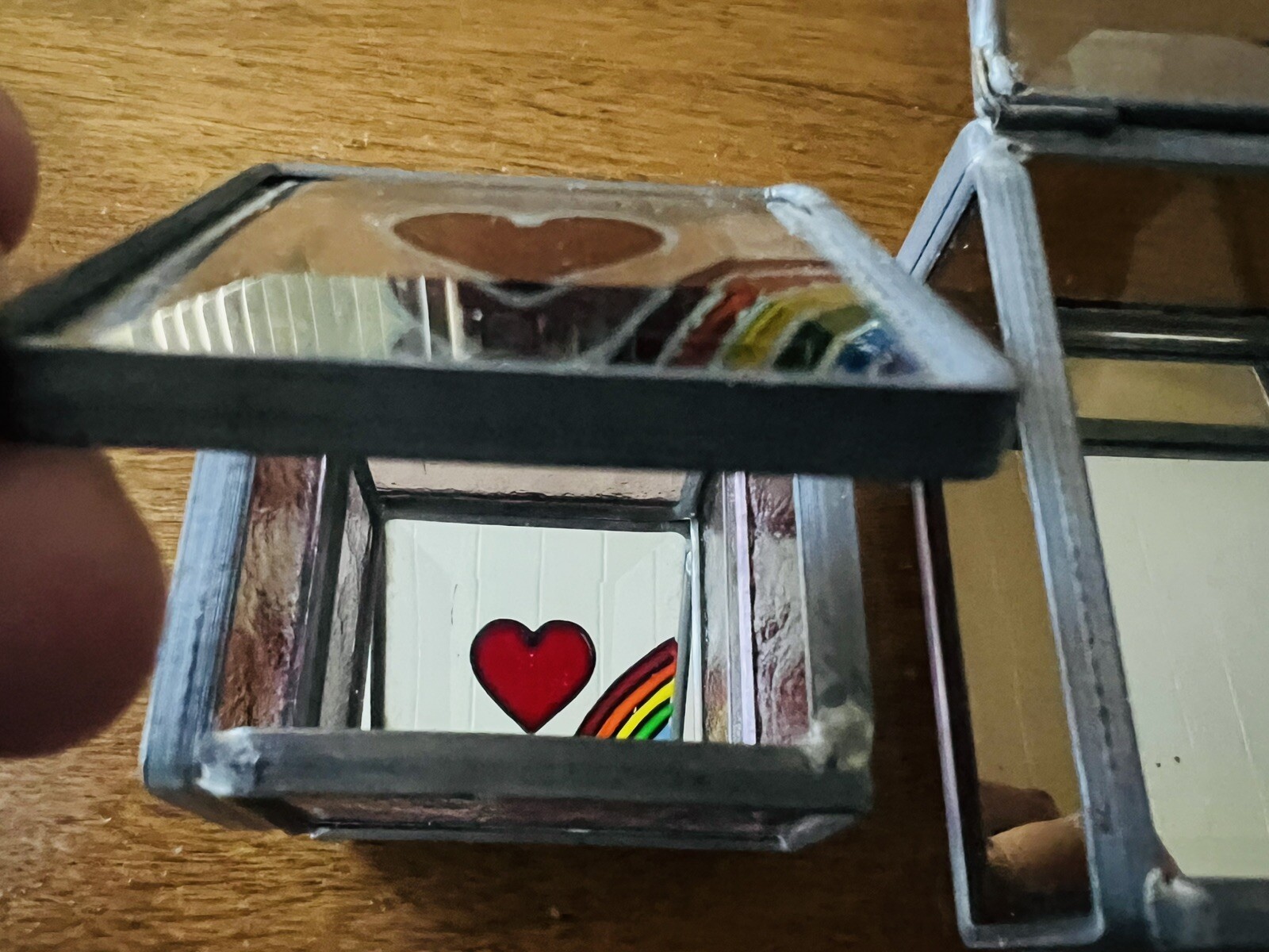 Vintage Trinket Jewelry Box Heart Rainbow Beveled Glass Mirror Bottom Leaded 2