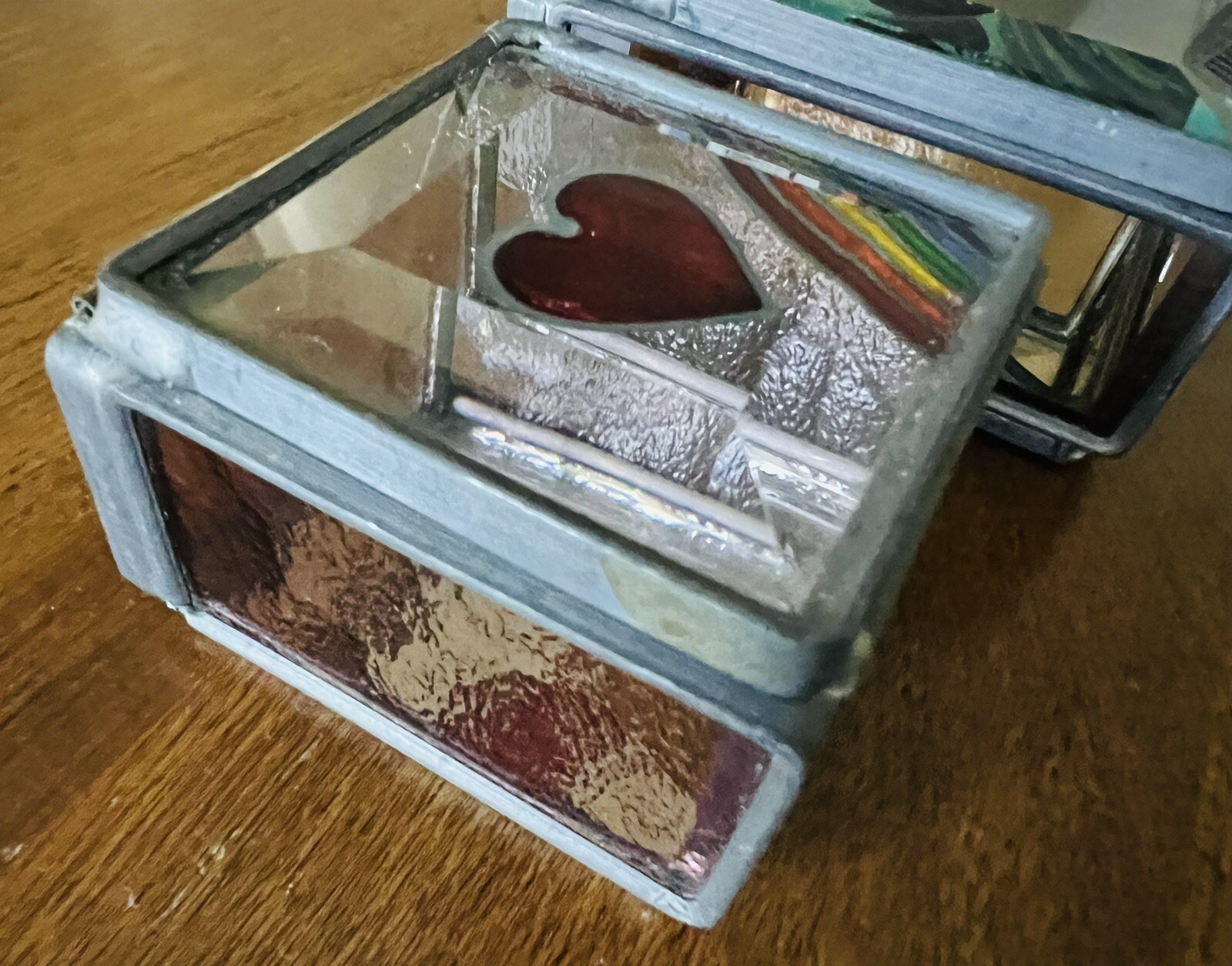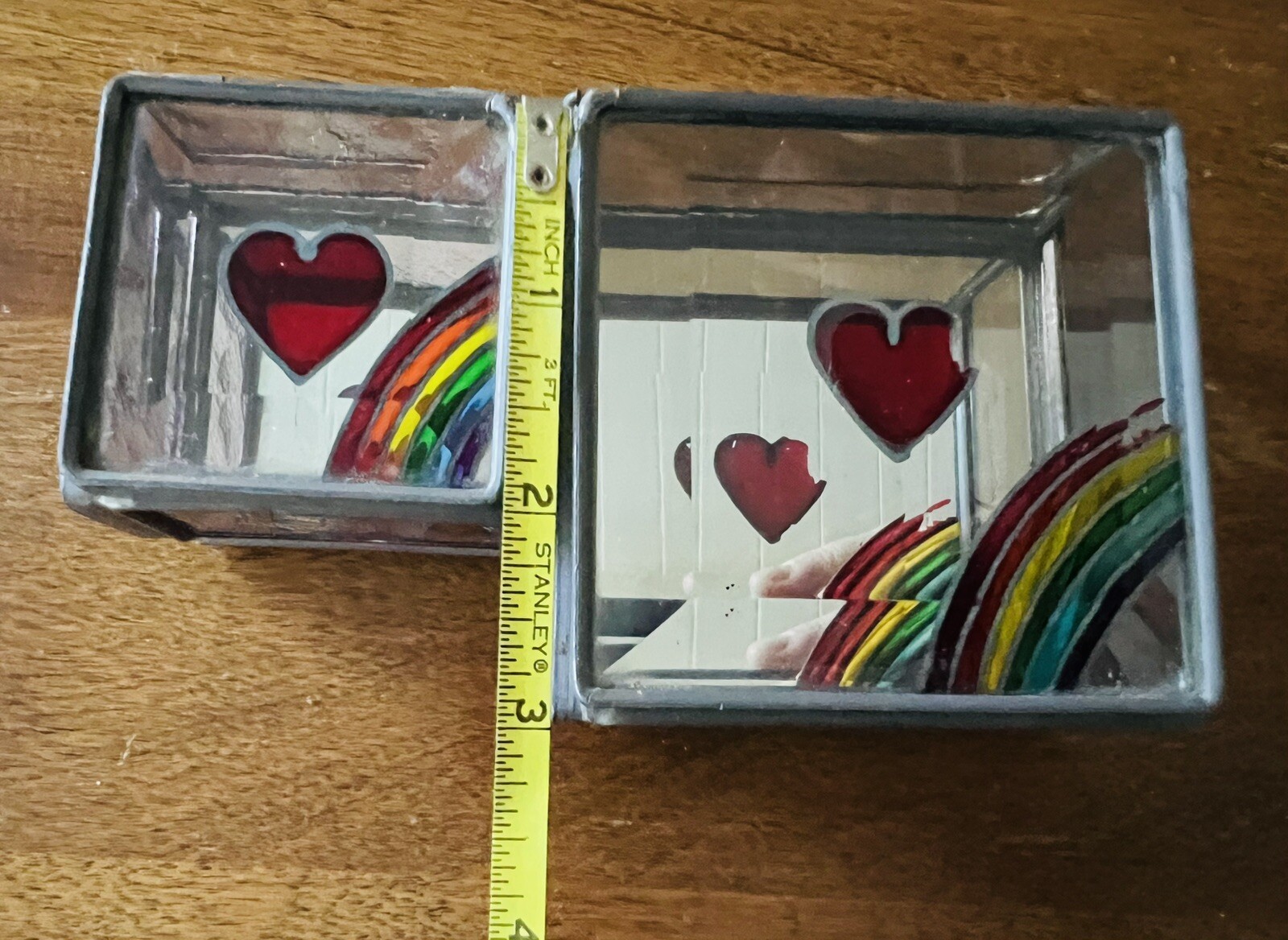 • Vintage Trinket Jewelry Box Heart Rainbow Beveled Glass Mirror Bottom Leaded 2