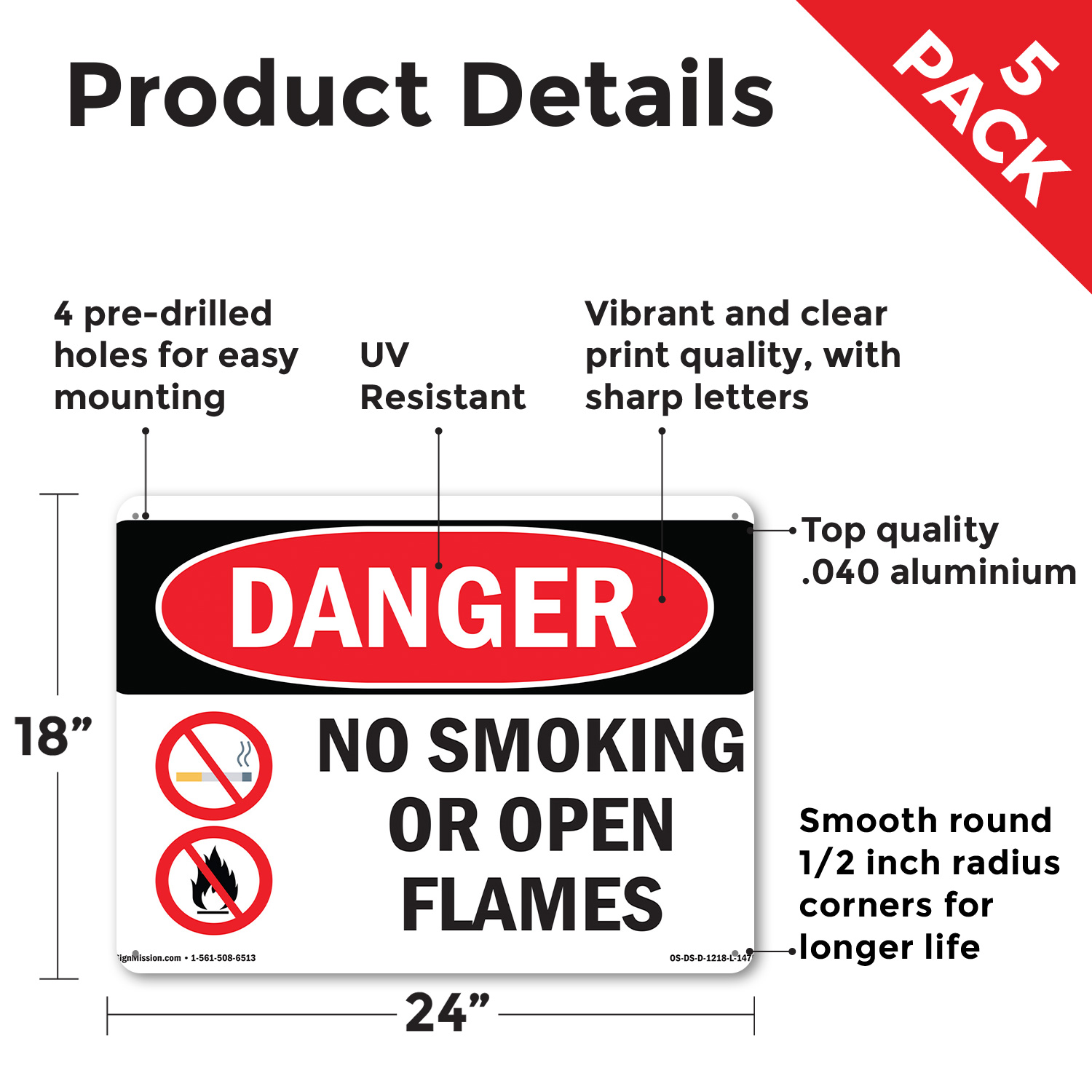 как выглядит No Smoking Or Open Flames OSHA Danger Sign Metal Plastic Or Decal - 5 or 10 Pack фото