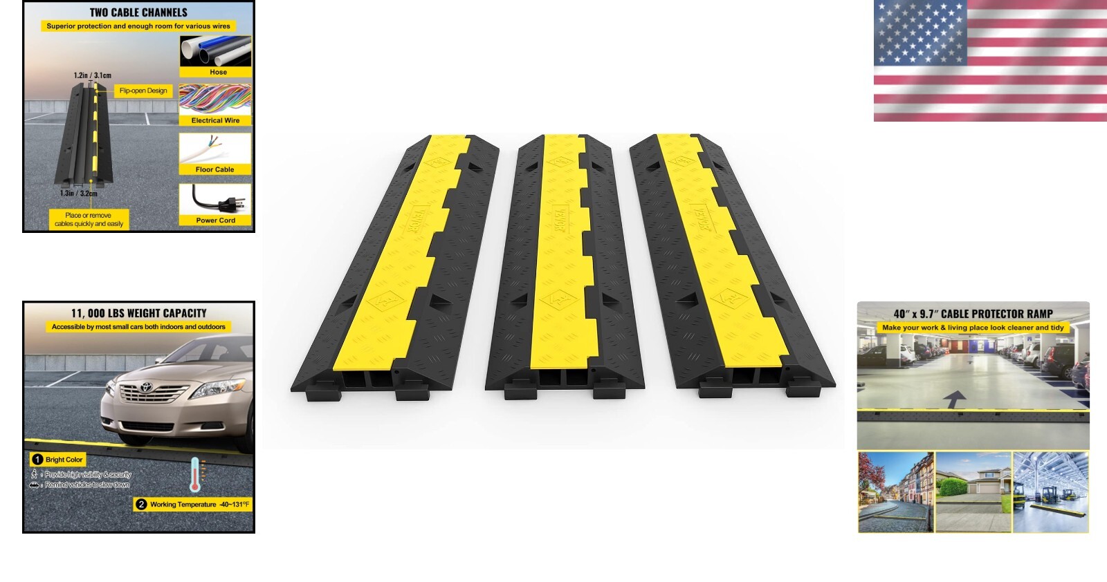 Heavy-Duty Rubber Cable Protector Ramp - 11000lbs Capacity in 3-Pack Design