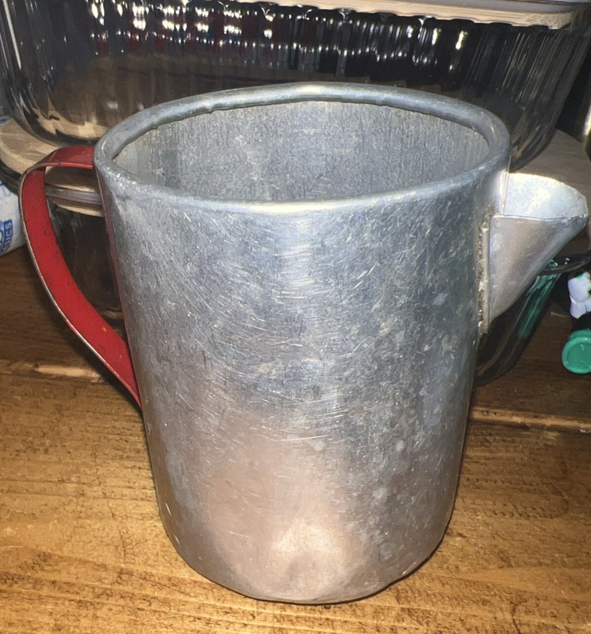 как выглядит Vintage Child s Pretend Play Kitchen Aluminum Creamer Cup Red Handle Toy фото