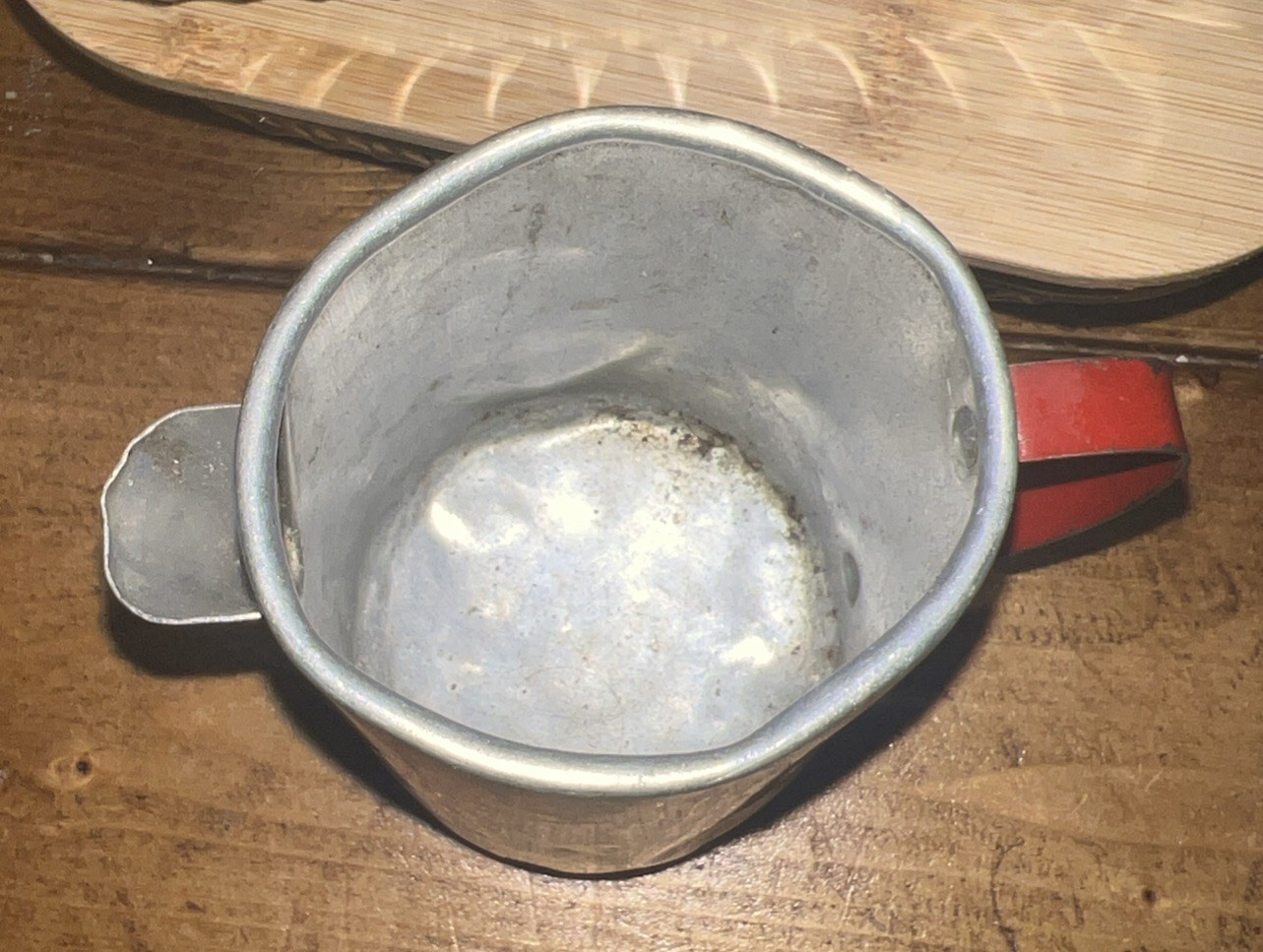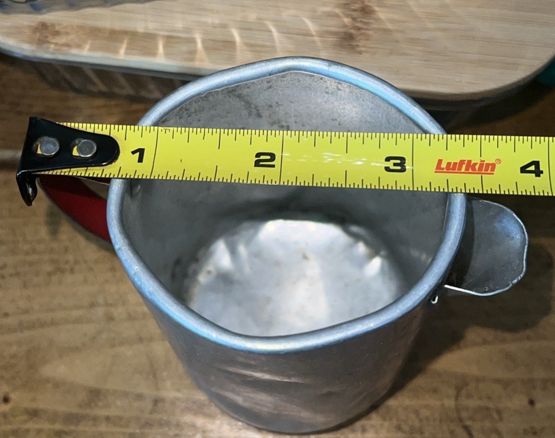 Vintage Child s Pretend Play Kitchen Aluminum Creamer Cup Red Handle Toy