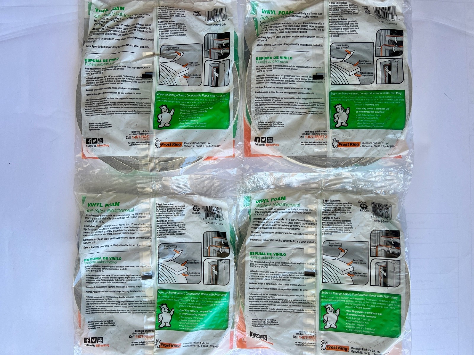 4 pack Vinyl Foam Tape Closed Cell 3/4Wide T1/2Thick 10'Long Grey V734