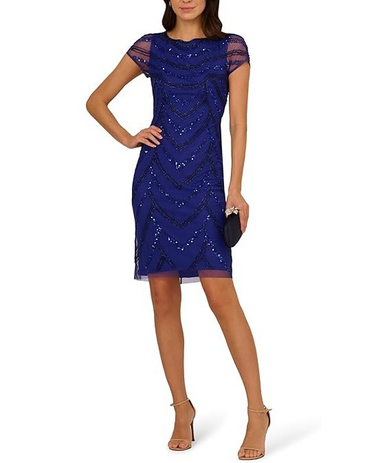 NWT 199 Adrianna Papell Beaded Mesh Cocktail Dress Dark Blue Violet 10