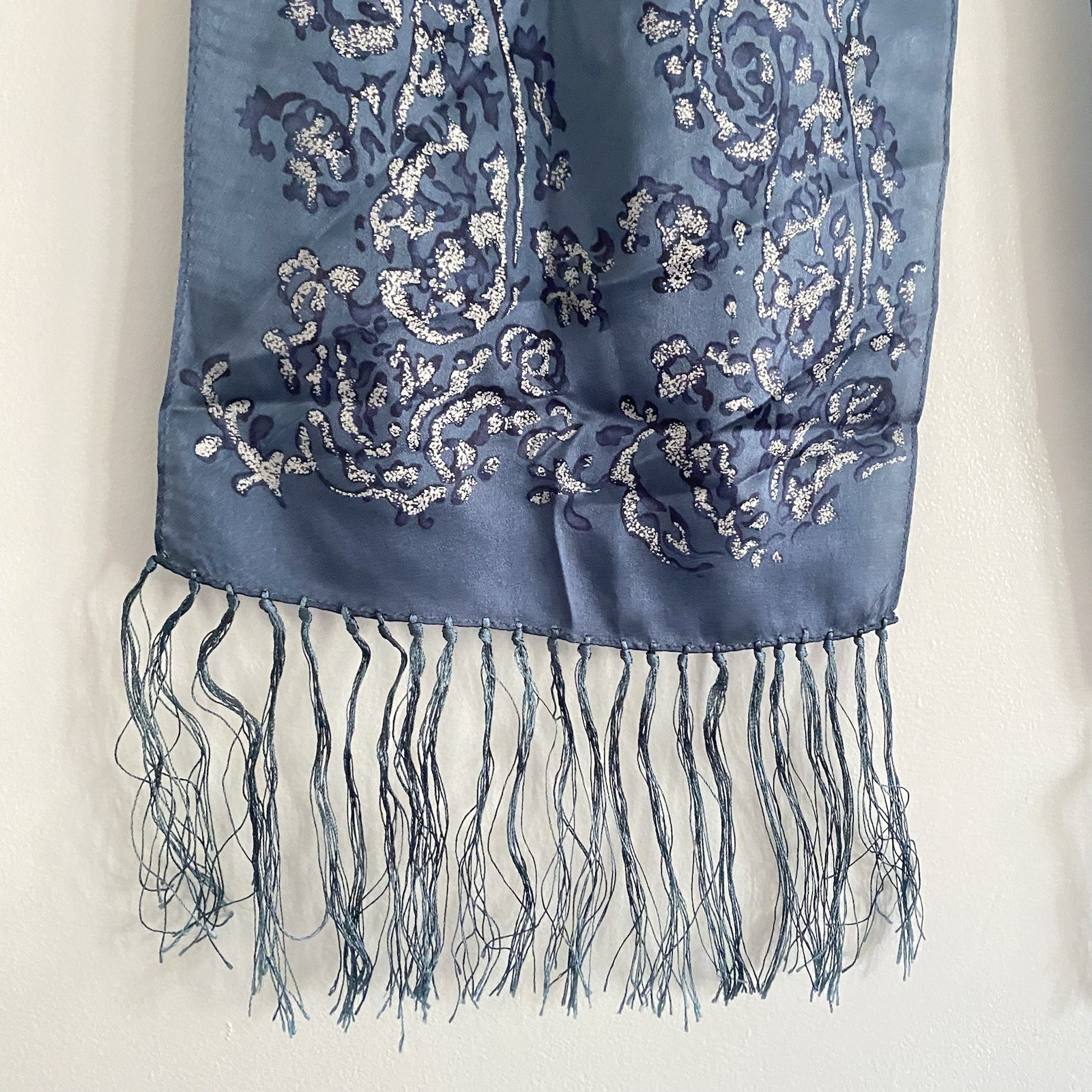 как выглядит VTG Elaine Gold 100 Silk Scarf Blue Satin Smooth With Fringe Abstract Animal фото