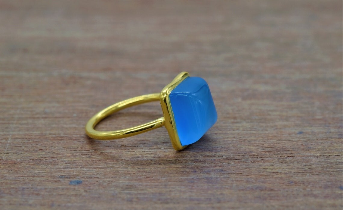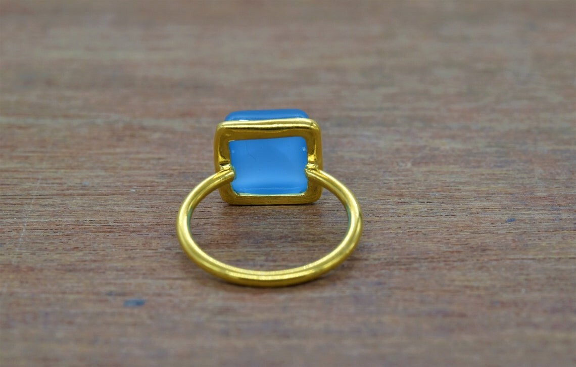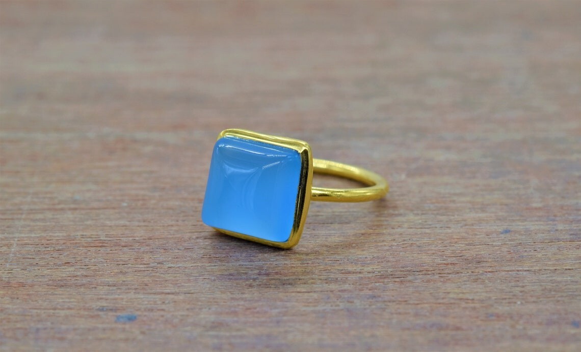 Gold Plated Square Shape Aqua Chalcedony Gemstone 925 Sterling Silver Ring Gifts