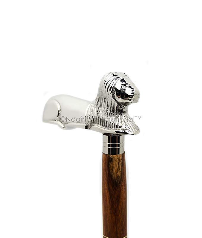 Vintage Brass Chrome Lion Head Handle Wooden Walking Stick Cane Antique Gifts