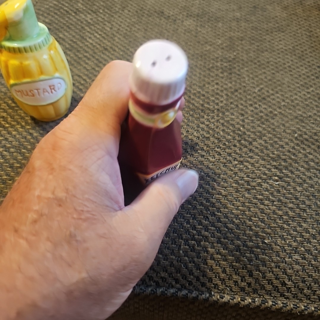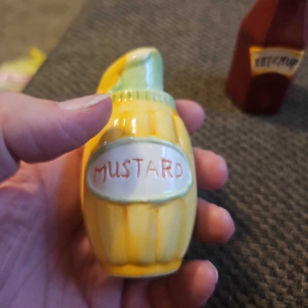 • vintage hand painted ceramic mustard and ketchup salt and pepper shakers